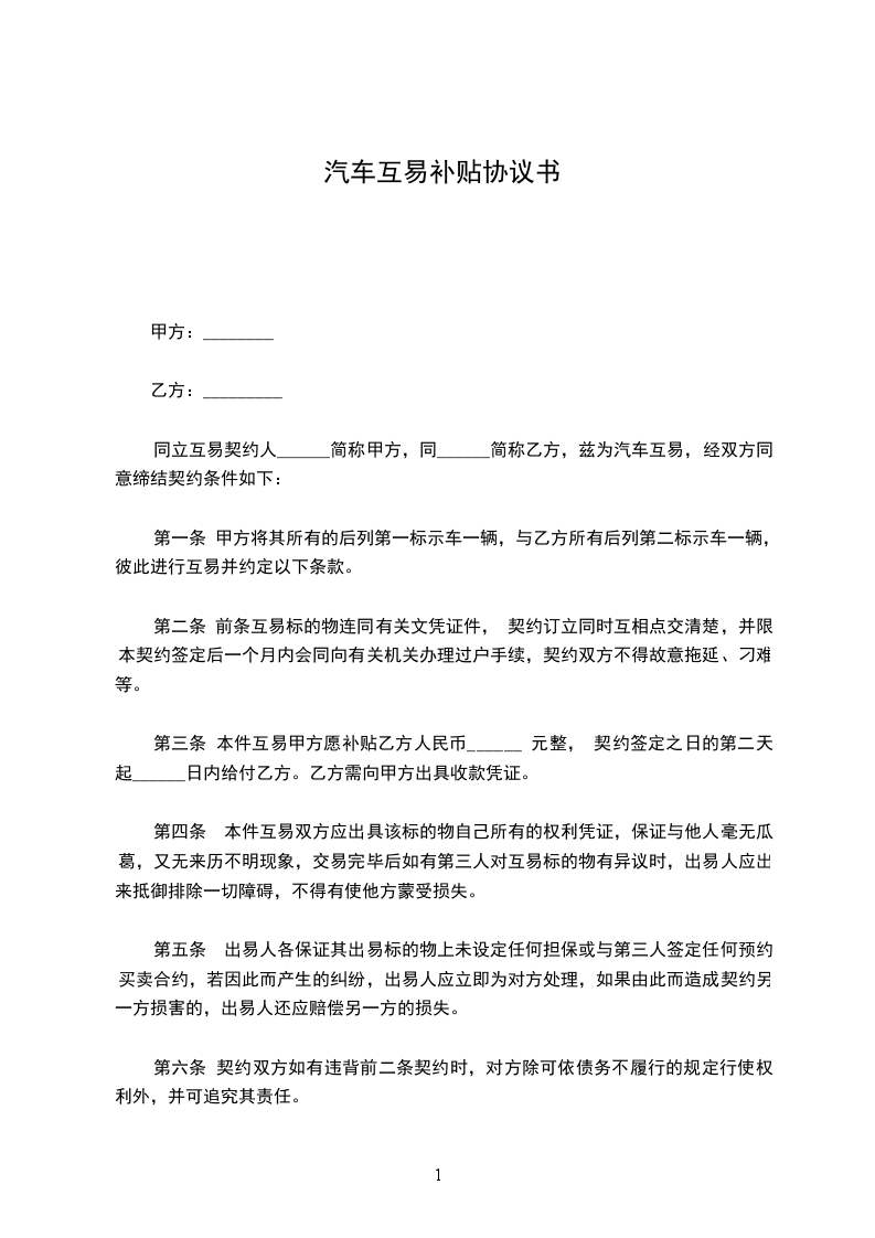 第三条 本件互易甲方愿补贴乙方人民币 元整,于即日乙方凭收据确实向甲方如数亲收足讫。