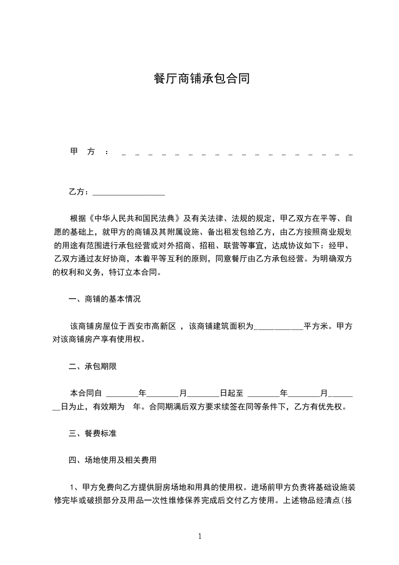 根据《中华人民共和国民法典》及有关法律、法规的规定,甲乙双方在平等、自愿的基础上,就甲方的商铺及其附属设施、备出租发包给乙方,由乙方按照商业规划的用途有范围进行承包经营或对外招商、招租、联营等事宜,达成协议如下:经甲、乙双方通过友好协商,本着平等互利的原则,同意餐厅由乙方承包经营。为明确双方的权利和义务,特订立本合同。