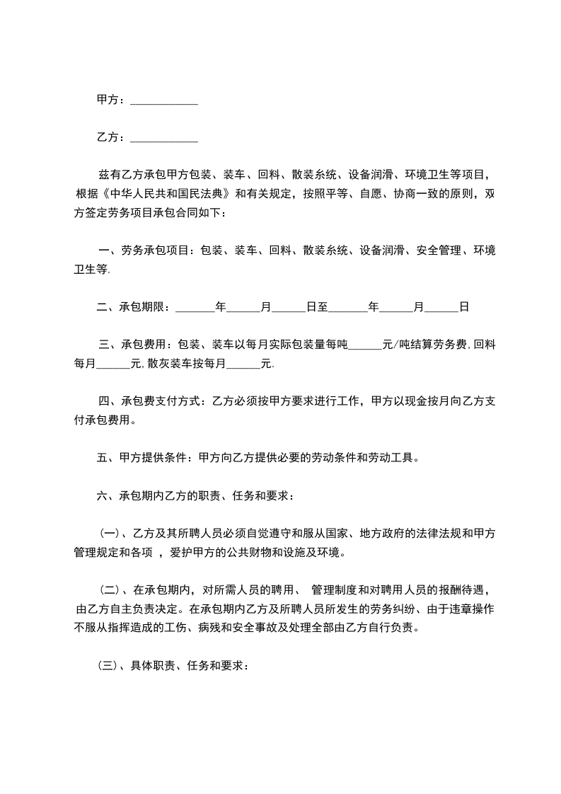 兹有乙方承包甲方包装、装车、回料、散装糸统、设备润滑、环境卫生等项目,根据《中华人民共和国民法典》和有关规定,按照平等、自愿、协商一致的原则,双方签定劳务项目承包合同如下: