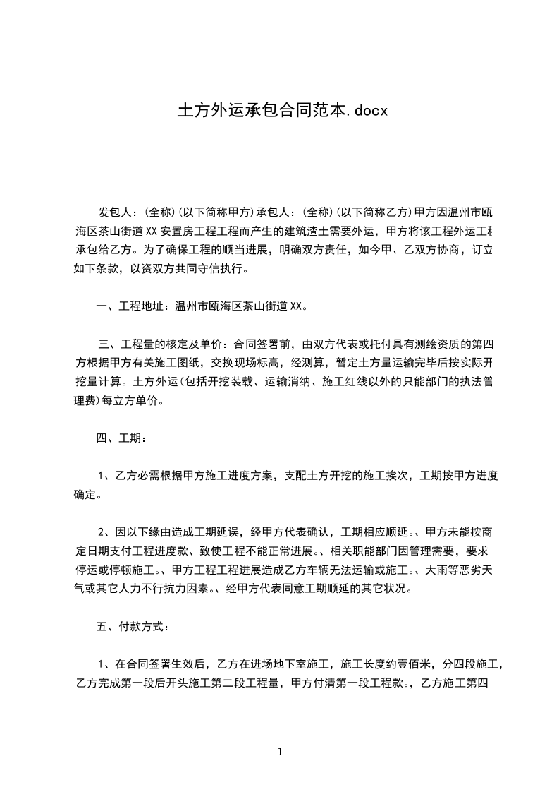 外运土方按每立方 元,在外运土方量达到外运总量的50%时,按实际外运数量支付 80 %的工程款,其余额待所需外运土方全部外运完工时,办理结帐手续, 60 天内一次性付清。