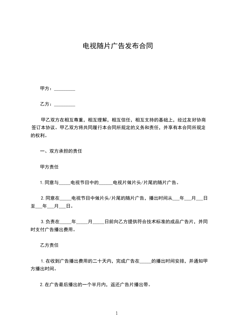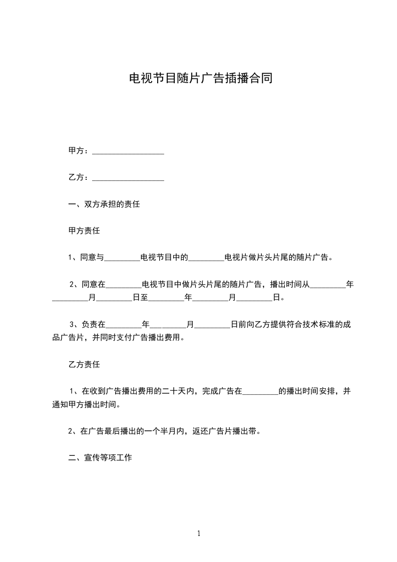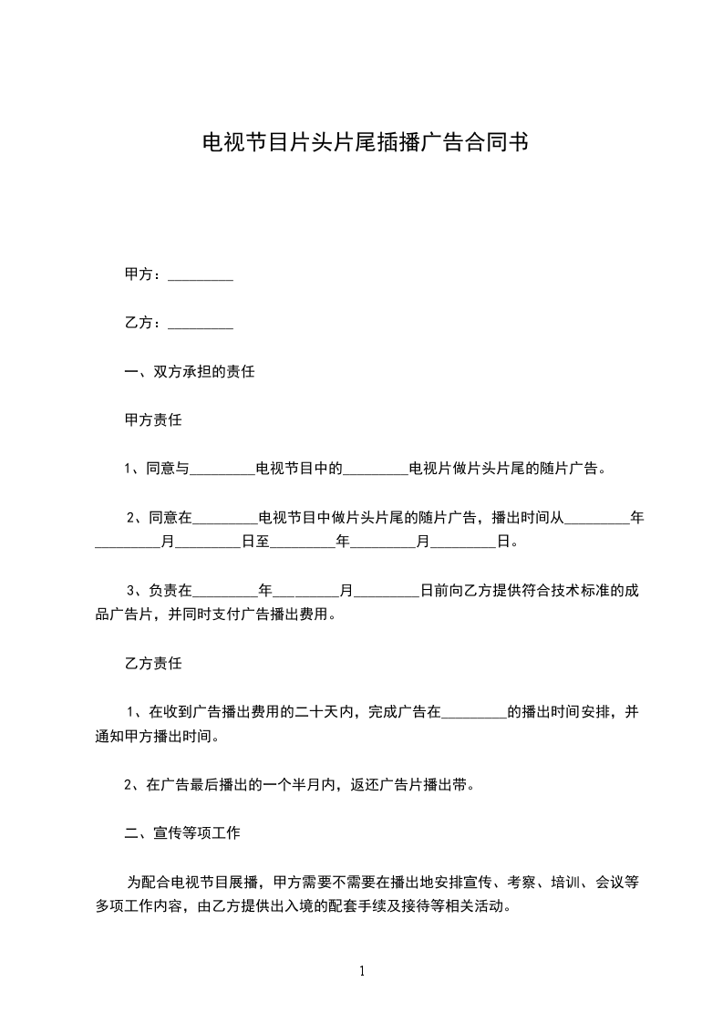 2、同意在_________电视节目中做片头片尾的随片广告,播出时间从_________年_________月_________日至_________年_________月_________日。