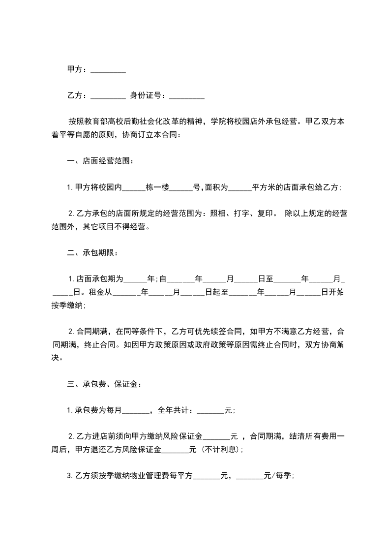 1.甲方将校园内______栋一楼______号,面积为______平方米的店面承包给乙方;