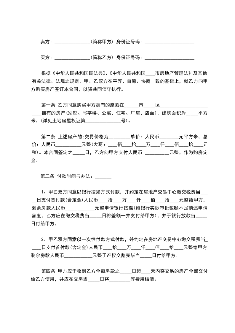 根据《中华人民共和国民法典》及其他有关法律法规之规定,甲、乙双方在平等、自愿、协商一致的基础上,就乙方购买甲方出售的房产事宜,签订本合同,以资共同遵守执行。