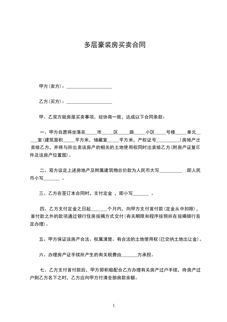 第一条 甲方同意出售甲方所有的位于__________市__________区__________幢__________号房。房屋建筑面积__________平方米,其中套内建筑面积为__________平方米。