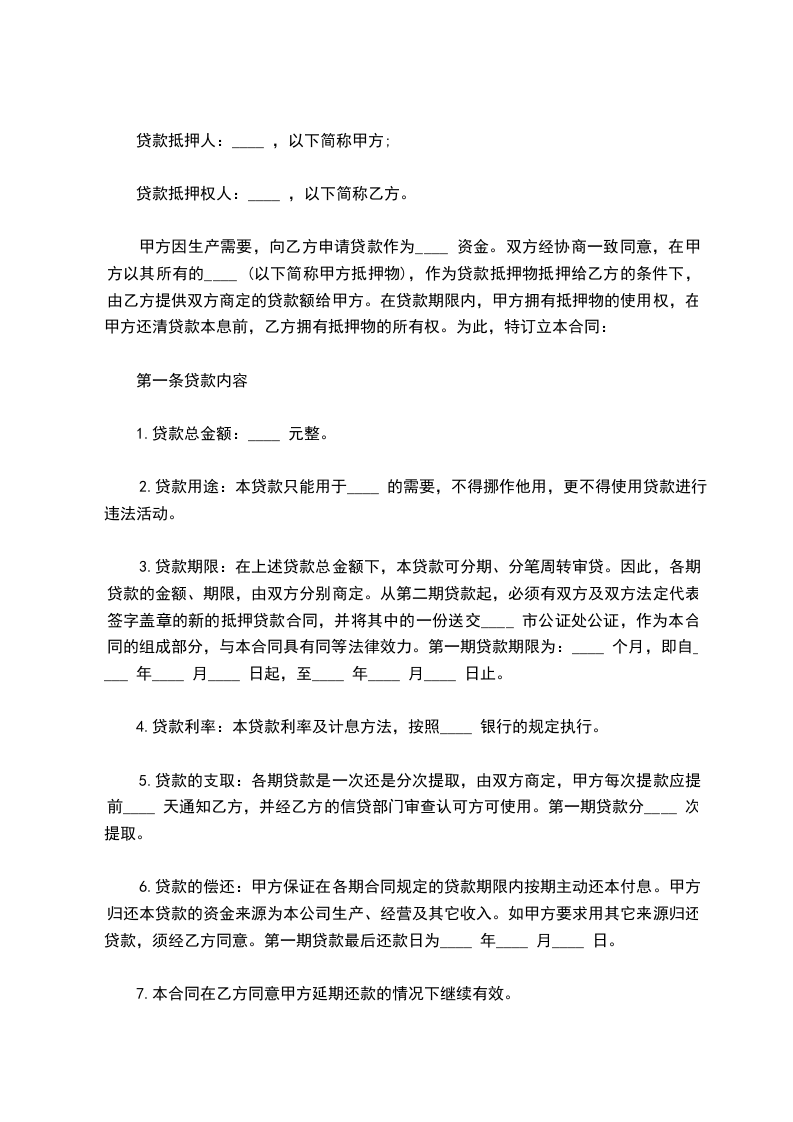 甲方因生产需要,向乙方申请贷款作为____ 资金。双方经协商一致同意,在甲方以其所有的____ (以下简称甲方抵押物),作为贷款抵押物抵押给乙方的条件下,由乙方提供双方商定的贷款额给甲方。在贷款期限内,甲方拥有抵押物的使用权,在甲方还清贷款本息前,乙方拥有抵押物的所有权。为此,特订立本合同: