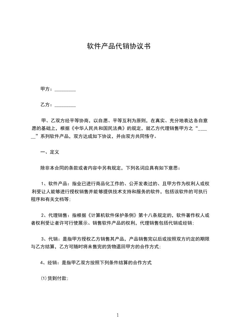 甲、乙双方经平等协商,以自愿、平等互利为原则,在真实、充分地表达各自意愿的基础上,根据《中华人民共和国民法典》的规定,就乙方代理销售甲方之“______”系列软件产品,双方达成如下协议,并由双方共同恪守。