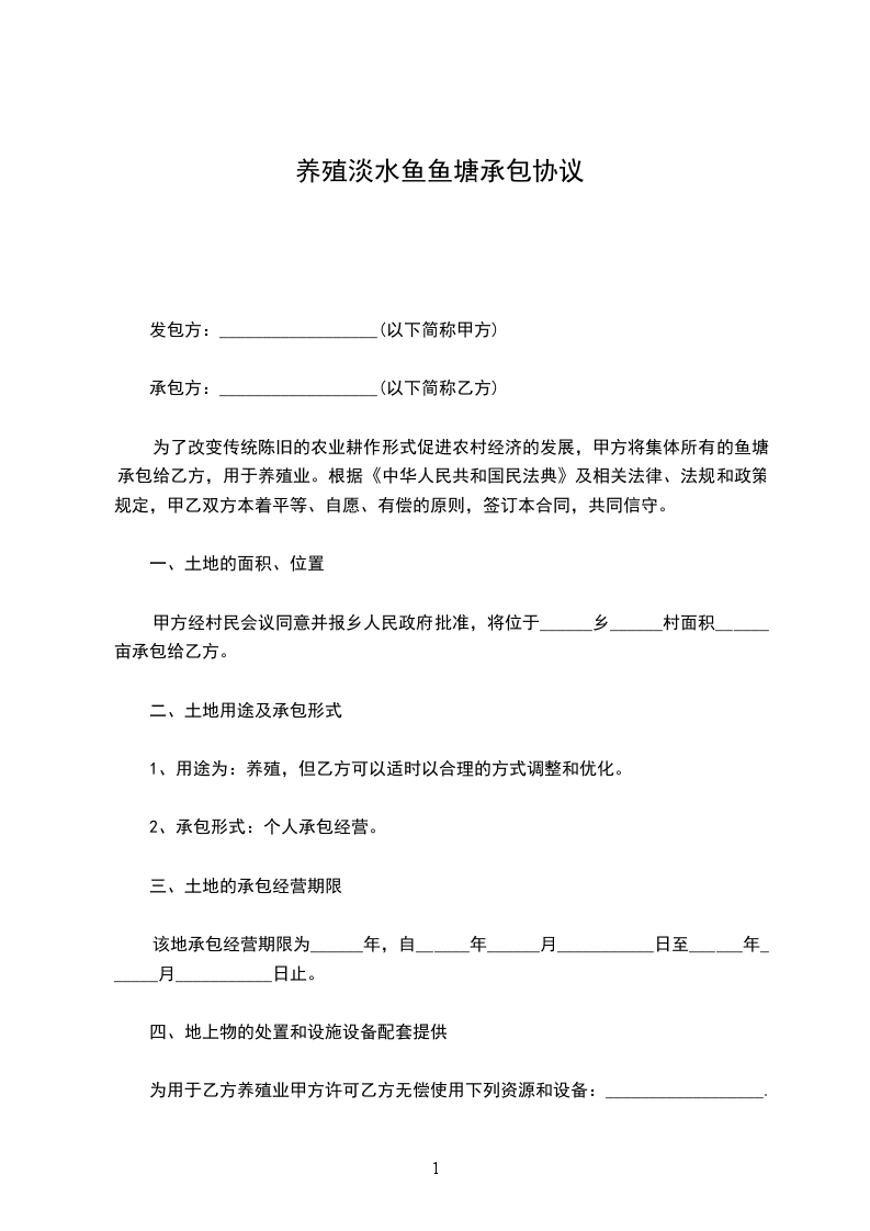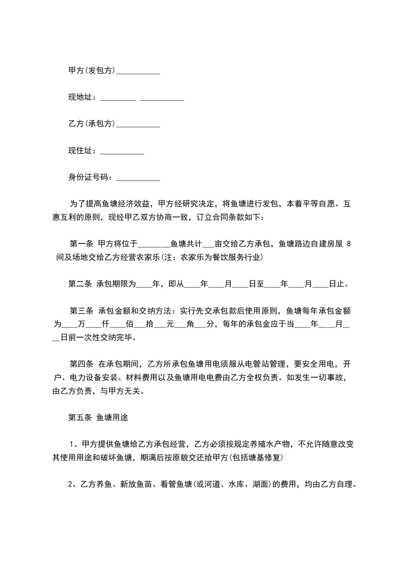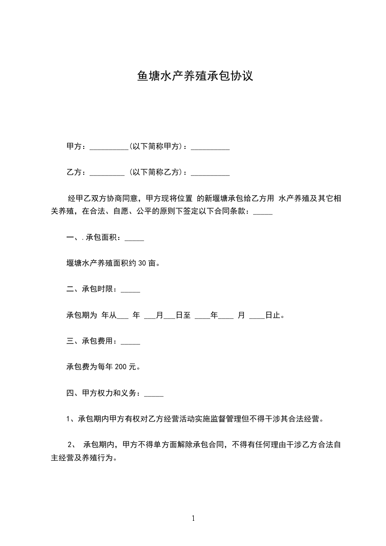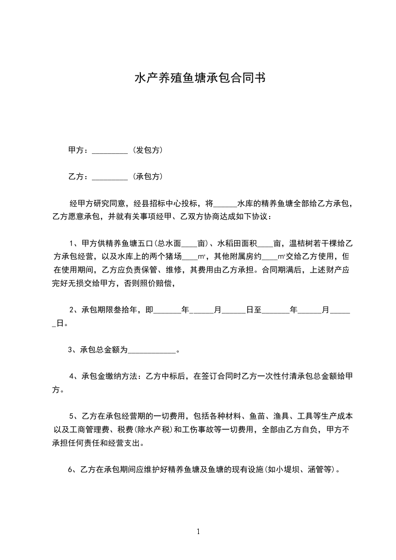 经甲乙双方协商同意,甲方现将位置于_________镇_________村_________的_________水库及甲方在_________水库边开挖的鱼塘承包给乙方用于水产养殖及其它相关养殖,在合法、自愿、公平的原则下签定以下合同条款: