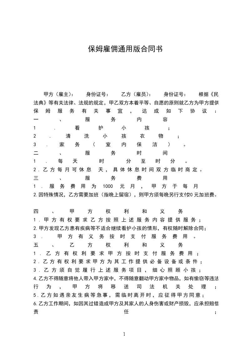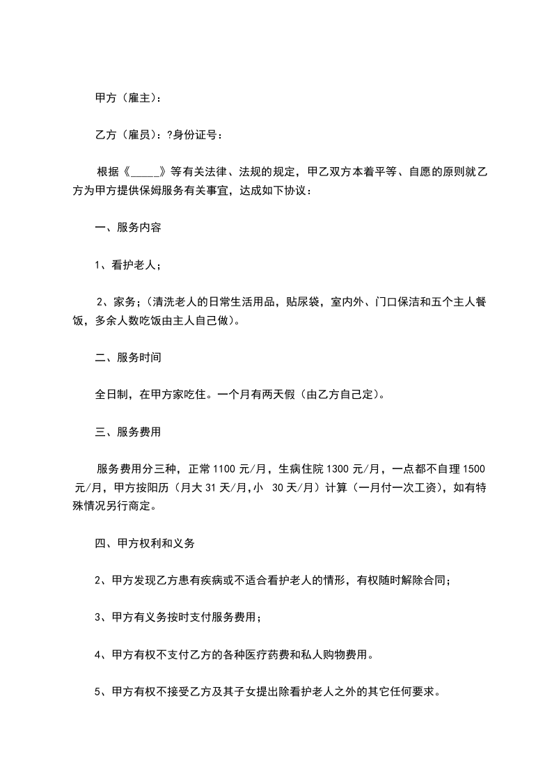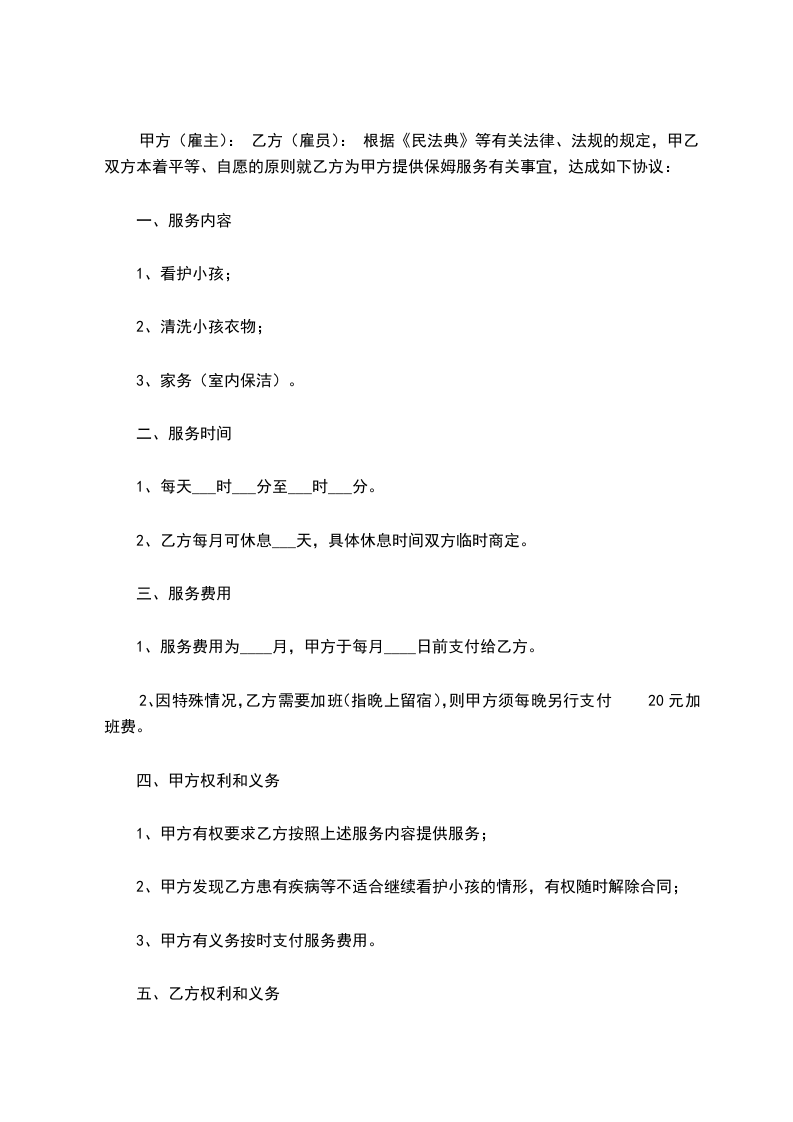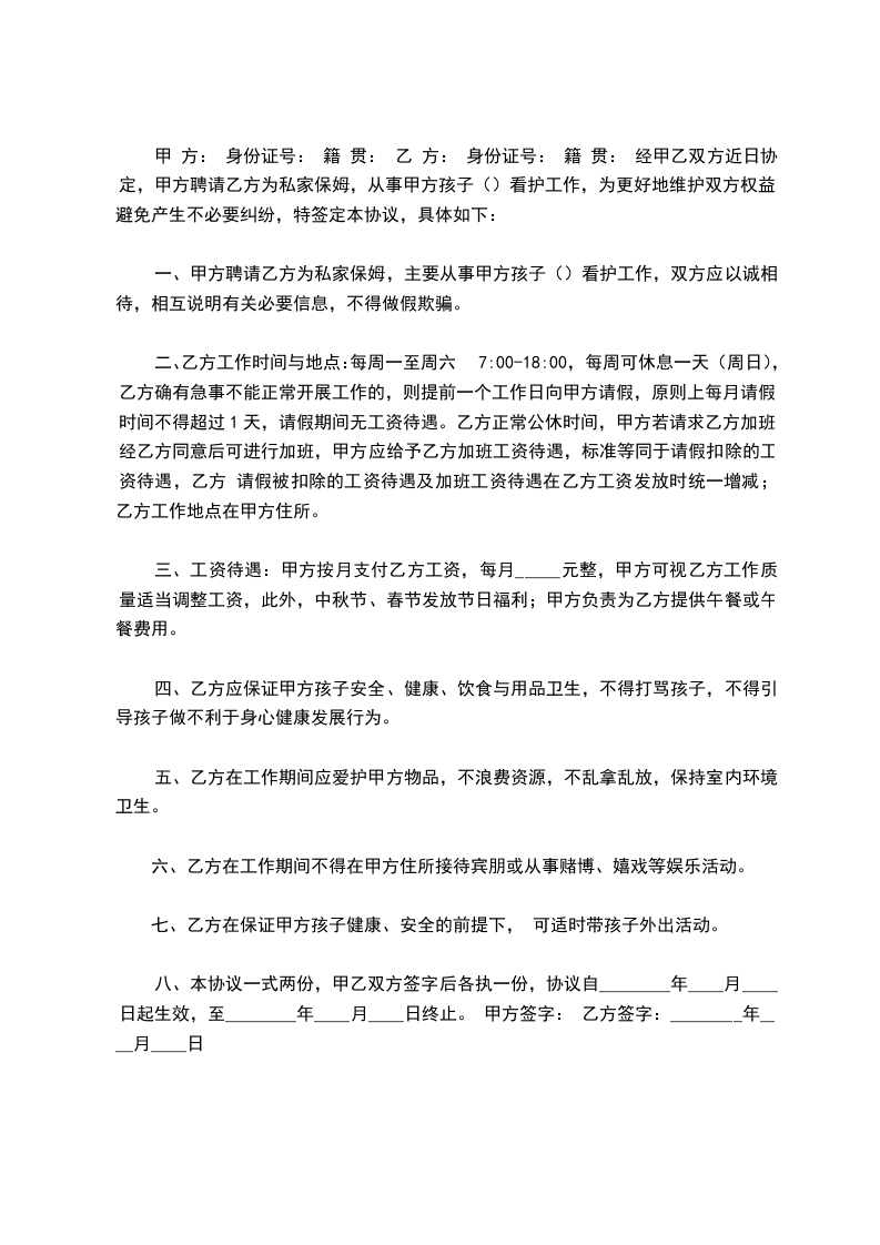 甲 方: 身份证号: 籍 贯: 乙 方: 身份证号: 籍 贯: 经甲乙双方近日协定,甲方聘请乙方为私家保姆,从事甲方孩子()看护工作,为更好地维护双方权益,避免产生不必要纠纷,特签定本协议,具体如下:
