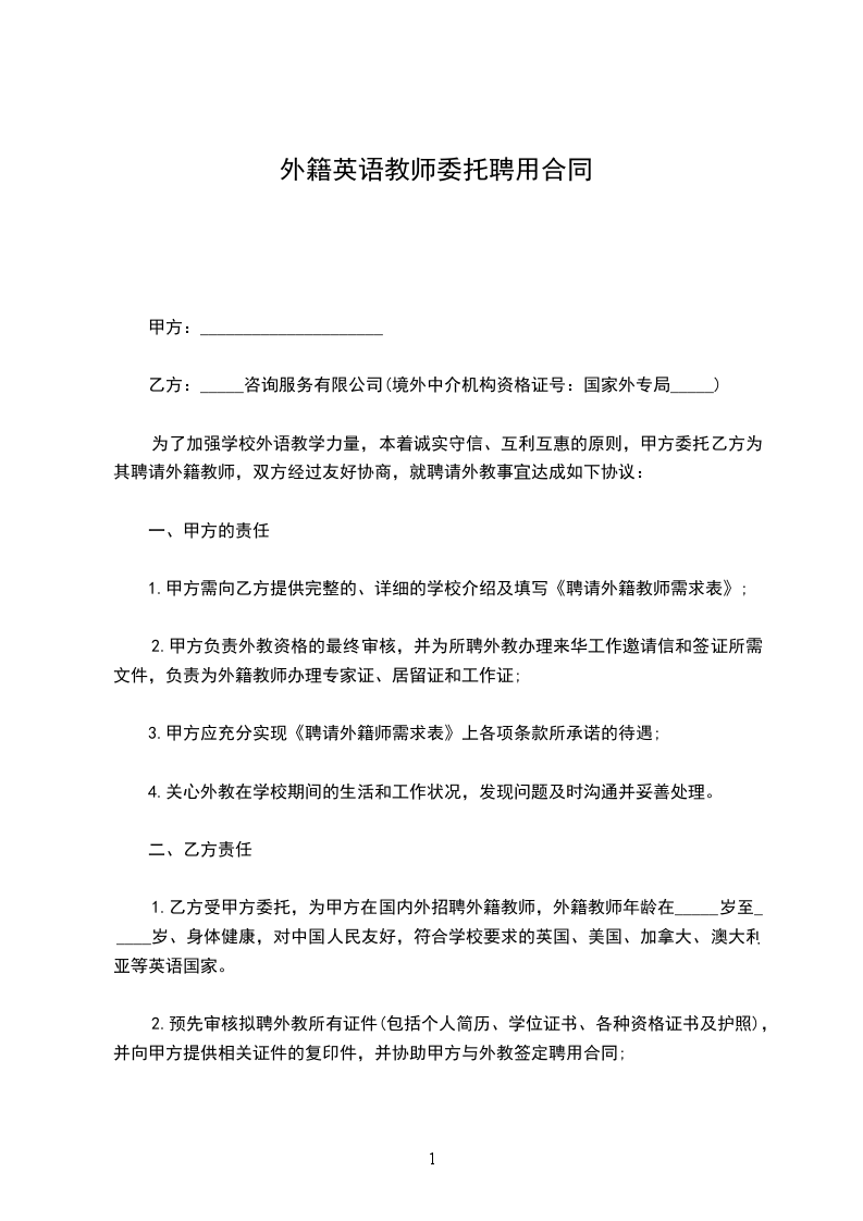 1.乙方受甲方委托,为甲方在国内外招聘外籍教师,外籍教师年龄在_____岁至_____岁、身体健康,对中国人民友好,符合学校要求的英国、美国、加拿大、澳大利亚等英语国家。