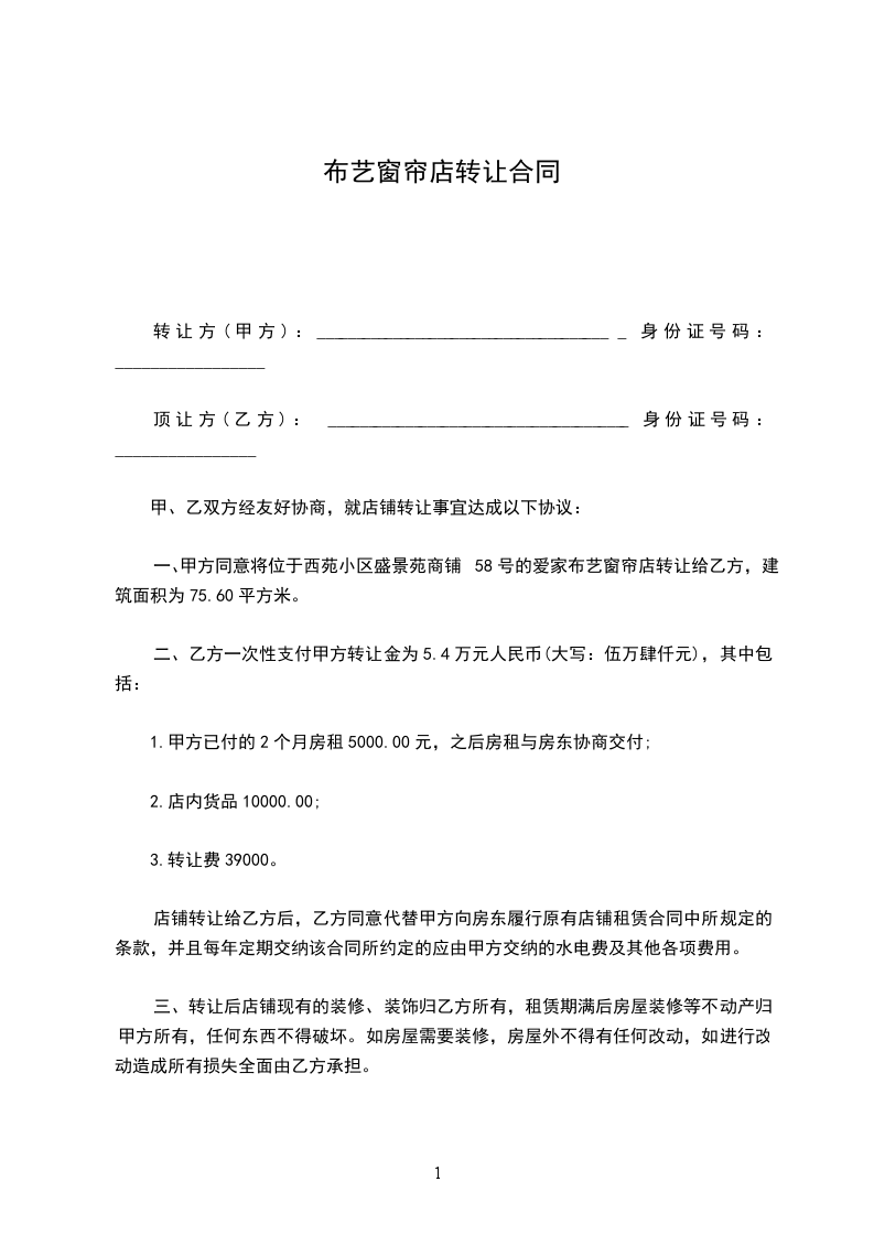 一、甲方同意将位于西苑小区盛景苑商铺58号的爱家布艺窗帘店转让给乙方,建筑面积为75.60平方米。