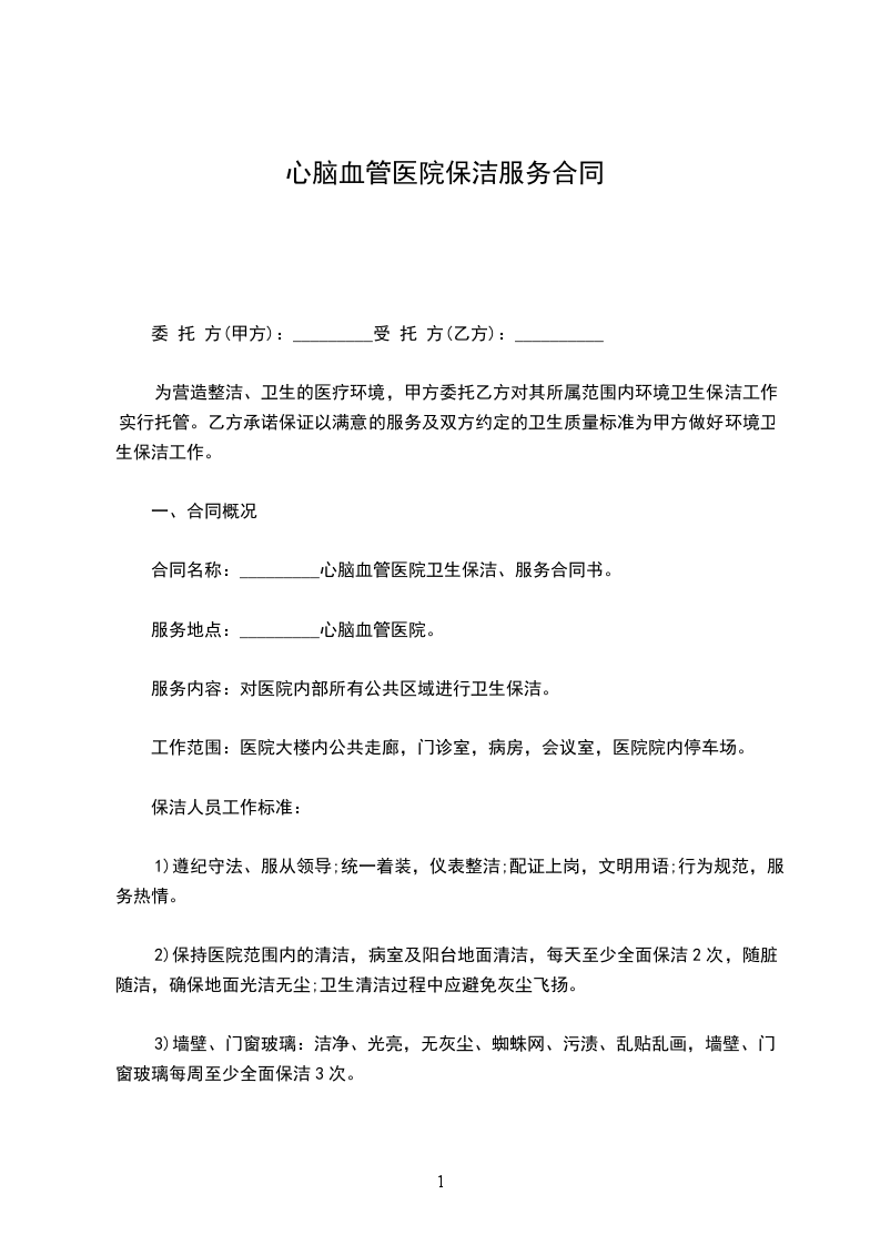 合同名称:_________心脑血管医院卫生保洁、服务合同书。