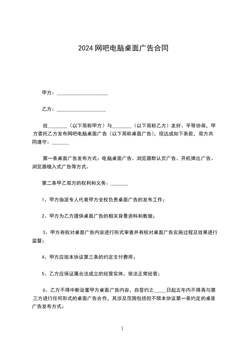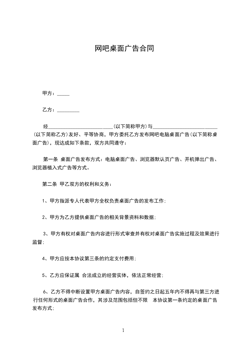 经__________________________(以下简称甲方)与__________________________(以下简称乙方)友好、平等协商,甲方委托乙方发布网吧电脑桌面广告(以下简称桌面广告),现达成如下条款,双方共同遵守: