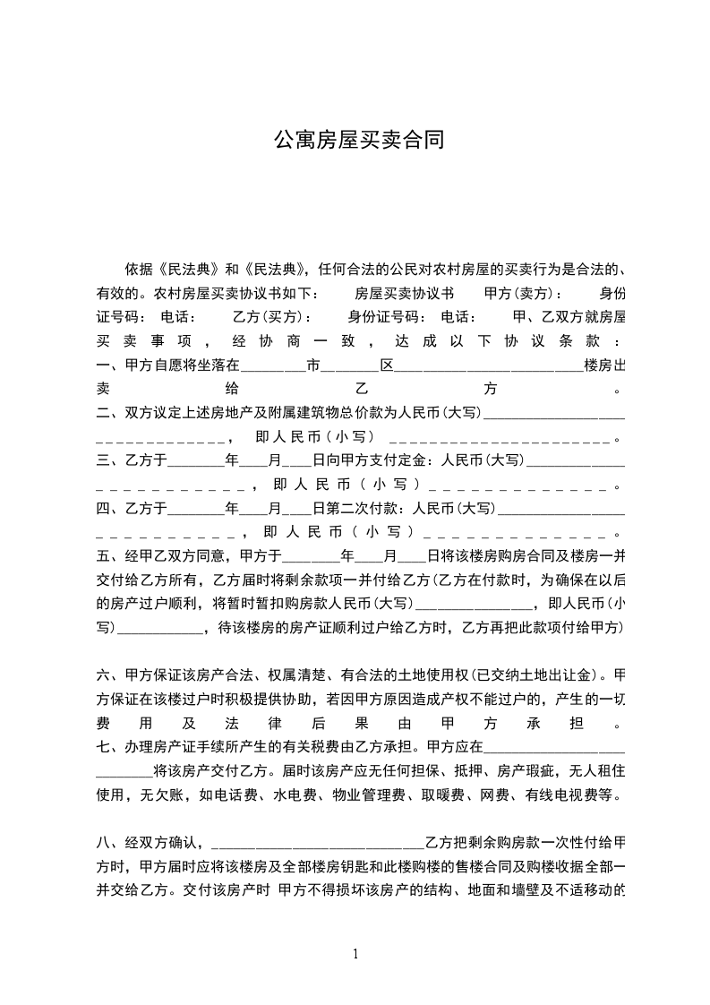 依据《民法典》,任何合法的公民对农村房屋的买卖行为是合法的、有效的。农村房屋买卖协议书如下: 房屋买卖协议书 甲方(卖方): 身份证号码: 电话: 乙方(买方): 身份证号码: 电话: 甲、乙双方就房屋买卖事项,经协商一致,达成以下协议条款: