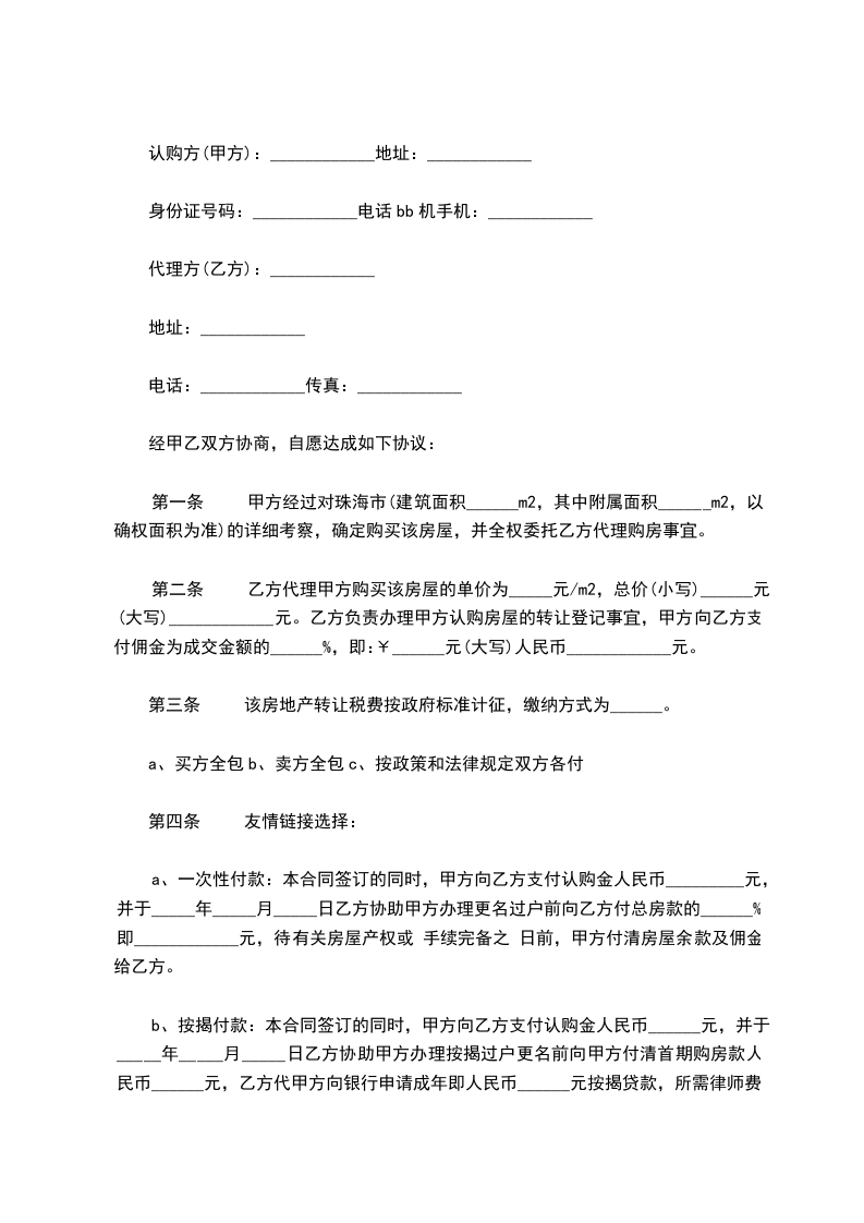 第二条 乙方代理甲方购买该房屋的单价为_____元/,总价(小写)__________元(大写)_____佰_____拾_____万_____仟_____佰_____拾_____元。乙方负责办理甲方认购房屋的转让登记事宜,甲方向乙方支付佣金为成交金额的_____% ,即:__________¥元(大写)人民币_____佰_____拾_____万_____仟_____佰_____拾_____元。