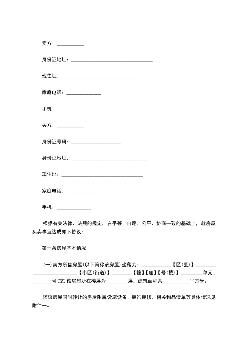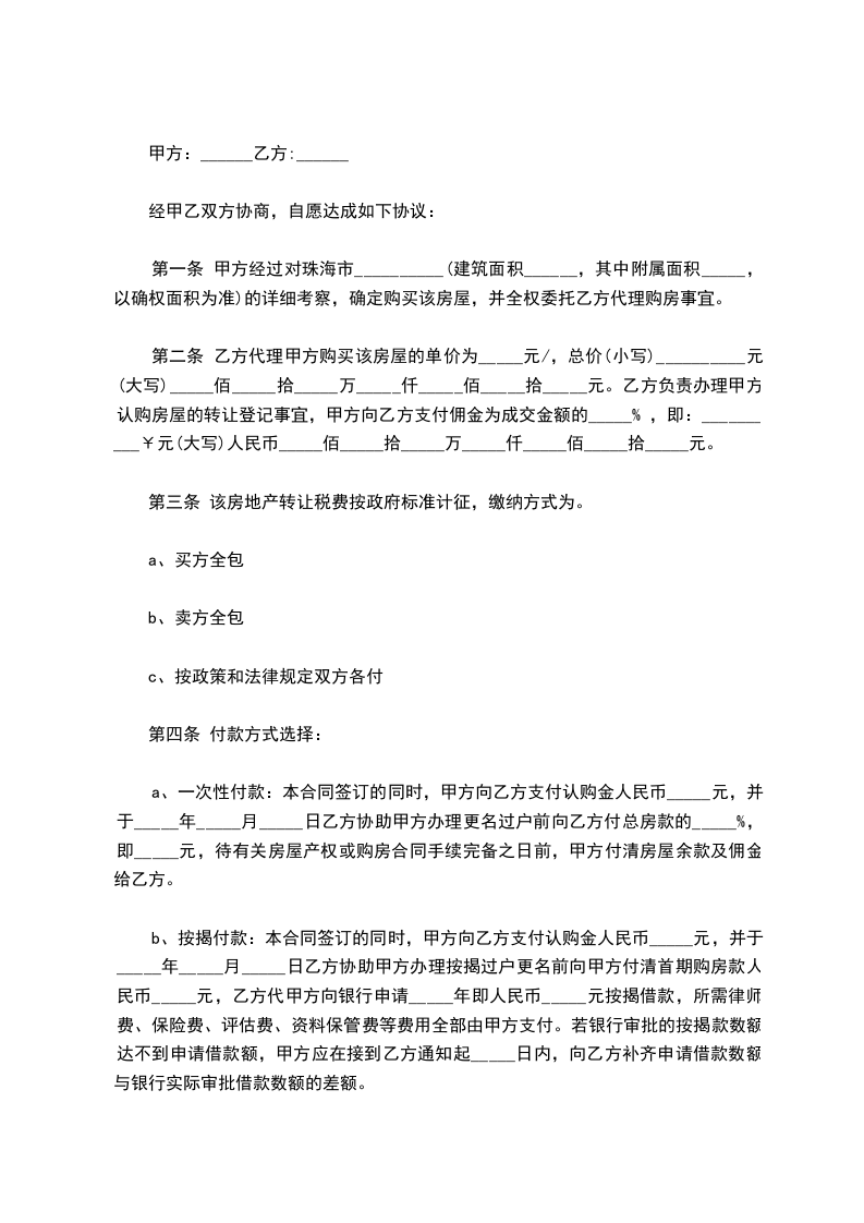 第一条 甲方经过对珠海市__________(建筑面积______,其中附属面积_____,以确权面积为准)的详细考察,确定购买该房屋,并全权委托乙方代理购房事宜。