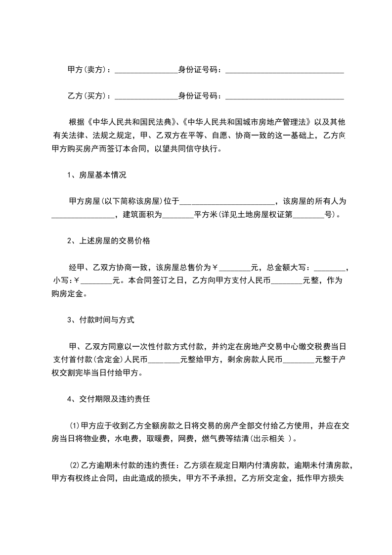 a、一次性付款:本合同签订的同时,甲方向乙方支付认购金人民币_____元,并于_____年_____月_____日乙方协助甲方办理更名过户前向乙方付总房款的_____%,即_____元,待有关房屋产权或购房合同手续完备之日前,甲方付清房屋余款及佣金给乙方。