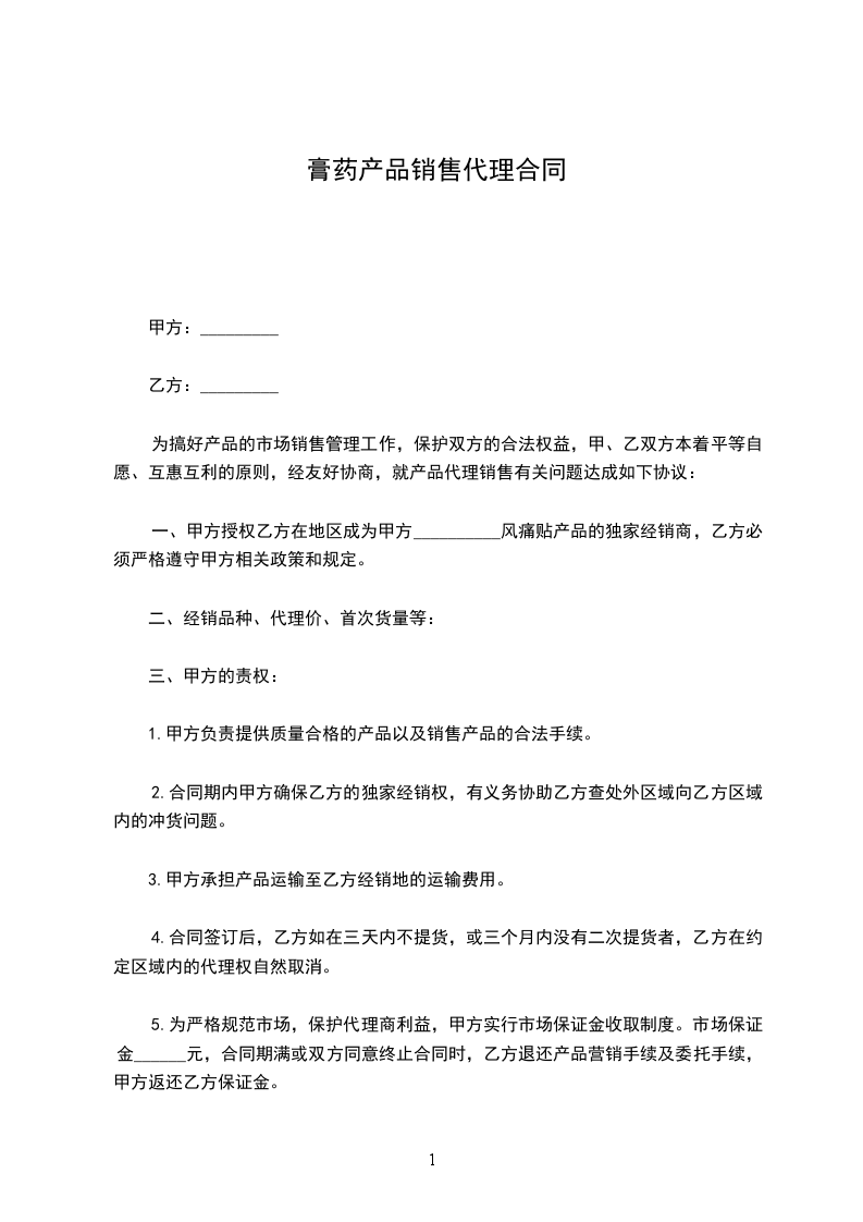 一、甲方授权乙方在地区成为甲方__________风痛贴产品的独家经销商,乙方必须严格遵守甲方相关政策和规定。