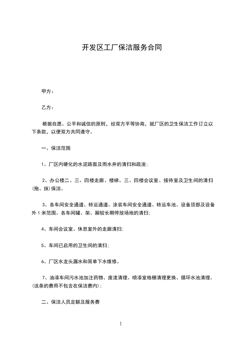根据自愿、公平和诚信的原则,经双方平等协商,就厂区的卫生保洁工作订立以下条款,以便双方共同遵守。