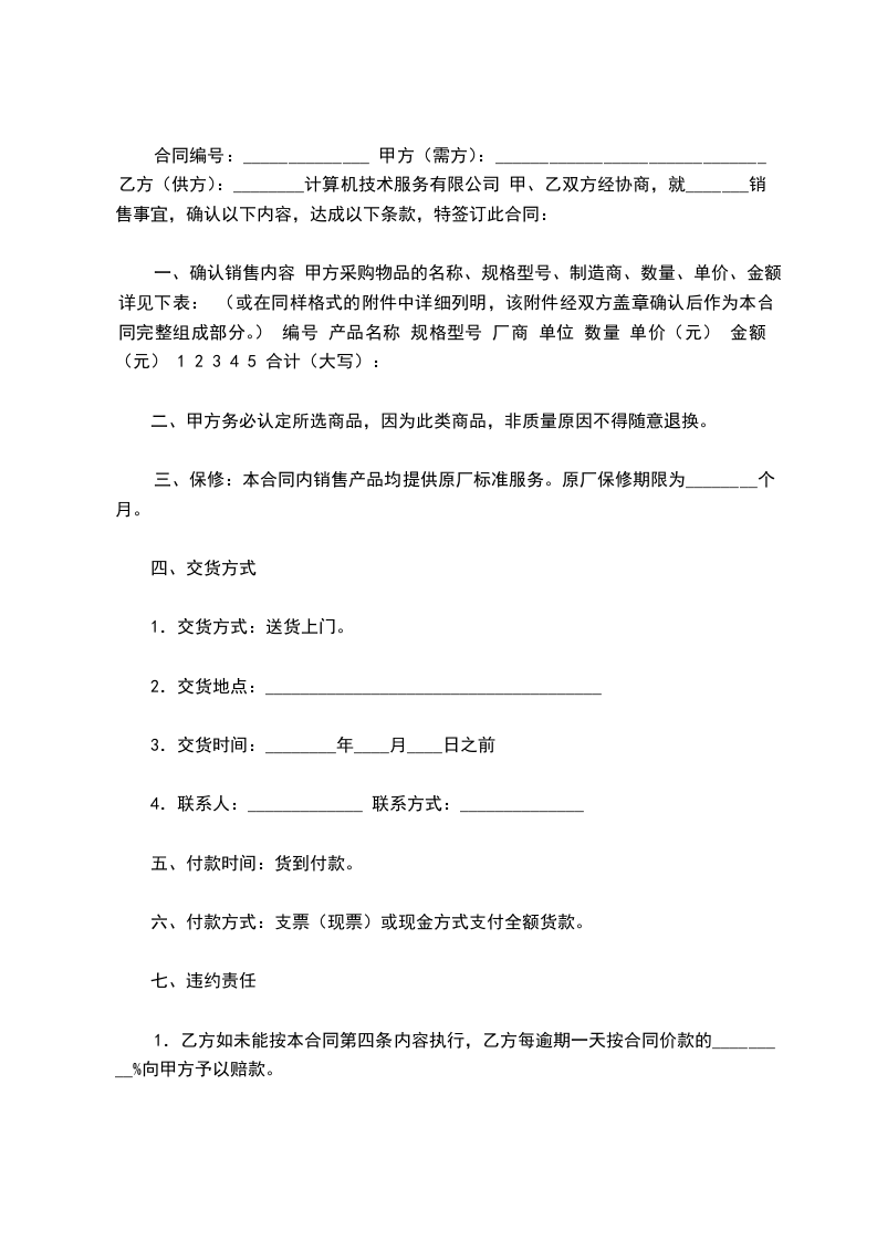 合同编号:______________ 甲方(需方):______________________________ 乙方(供方):________计算机技术服务有限公司 甲、乙双方经协商,就_______销售事宜,确认以下内容,达成以下条款,特签订此合同: