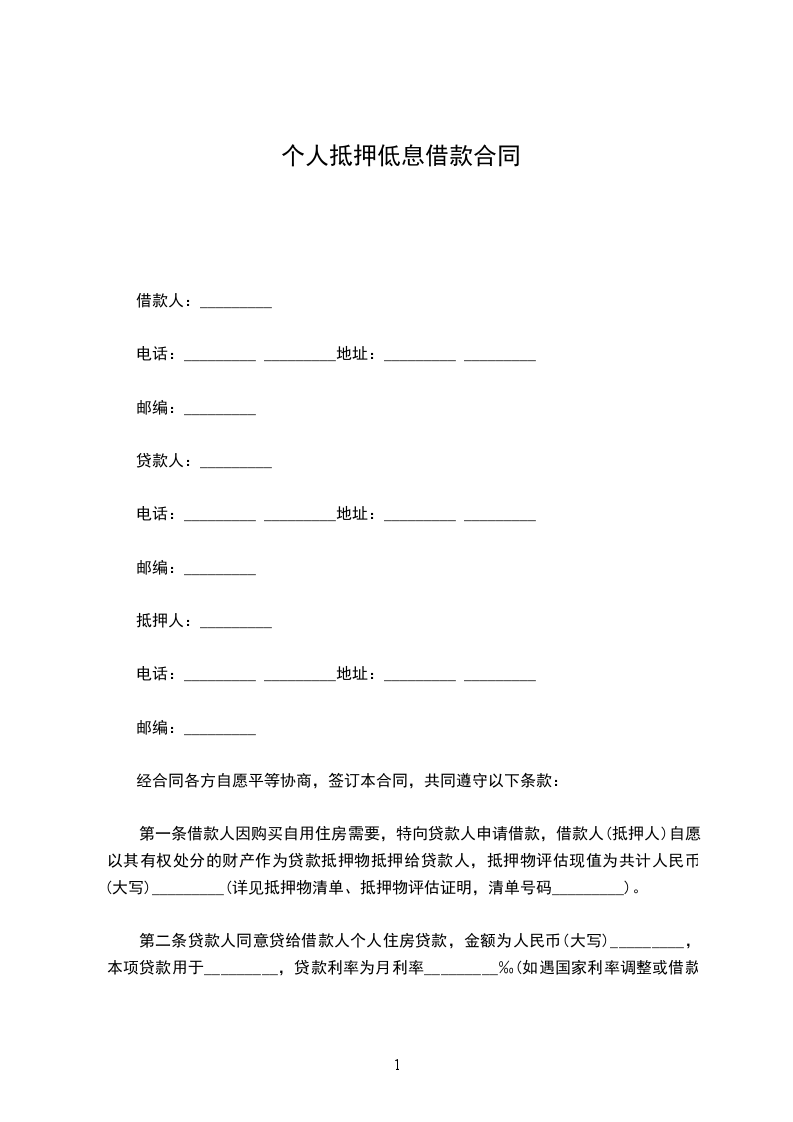第一条借款人因购买自用住房需要,特向贷款人申请借款,借款人(抵押人)自愿以其有权处分的财产作为贷款抵押物抵押给贷款人,抵押物评估现值为共计人民币(大写)_________(详见抵押物清单、抵押物评估证明,清单号码_________)。