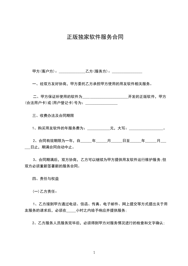 一、经双方友好协商,甲方委托乙方承担甲方使用的用友软件相关服务。