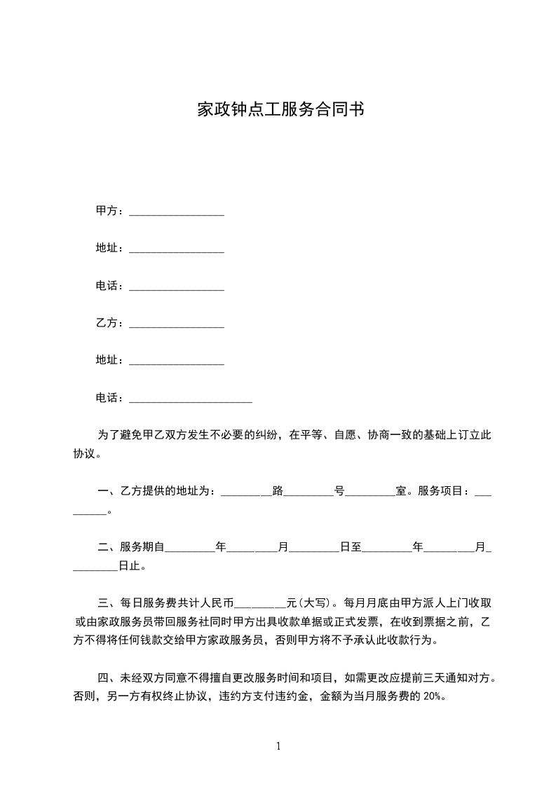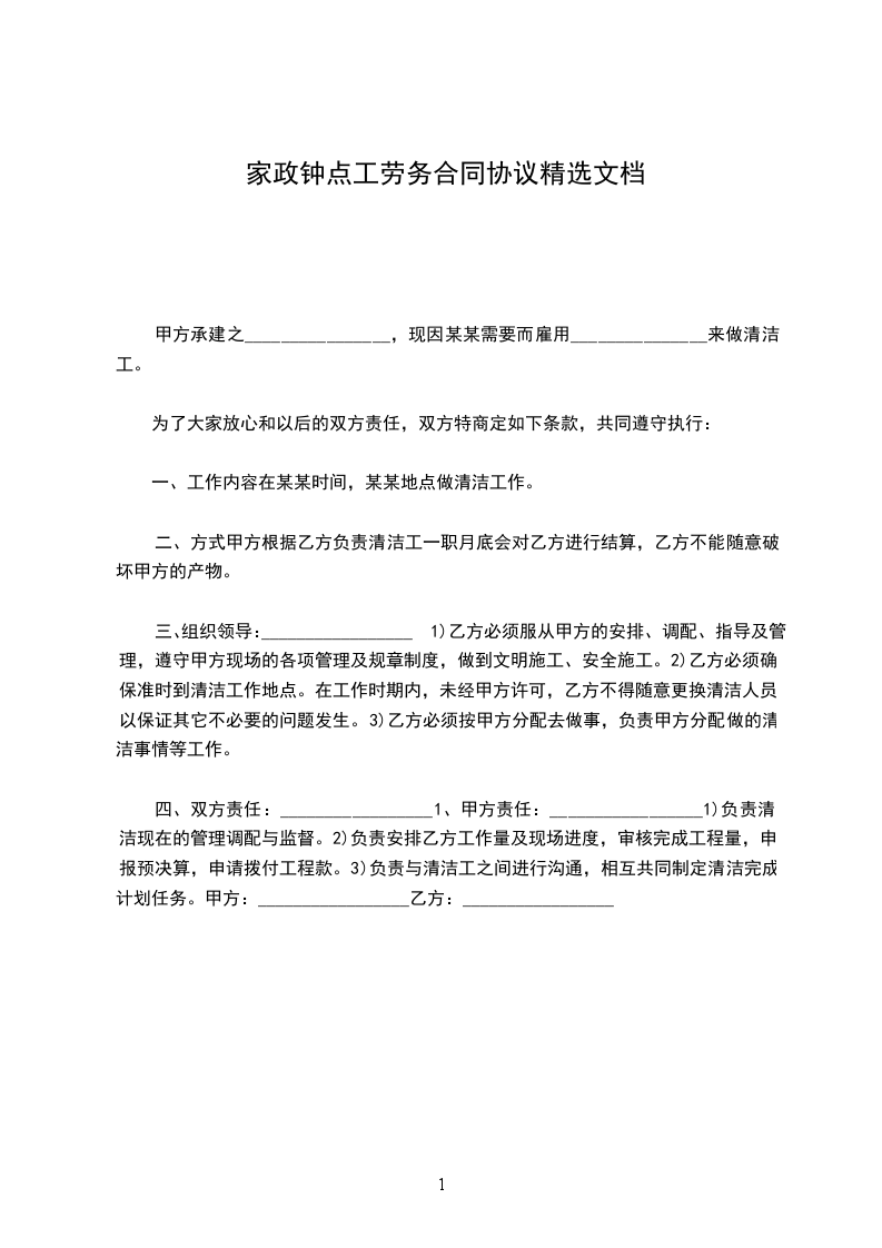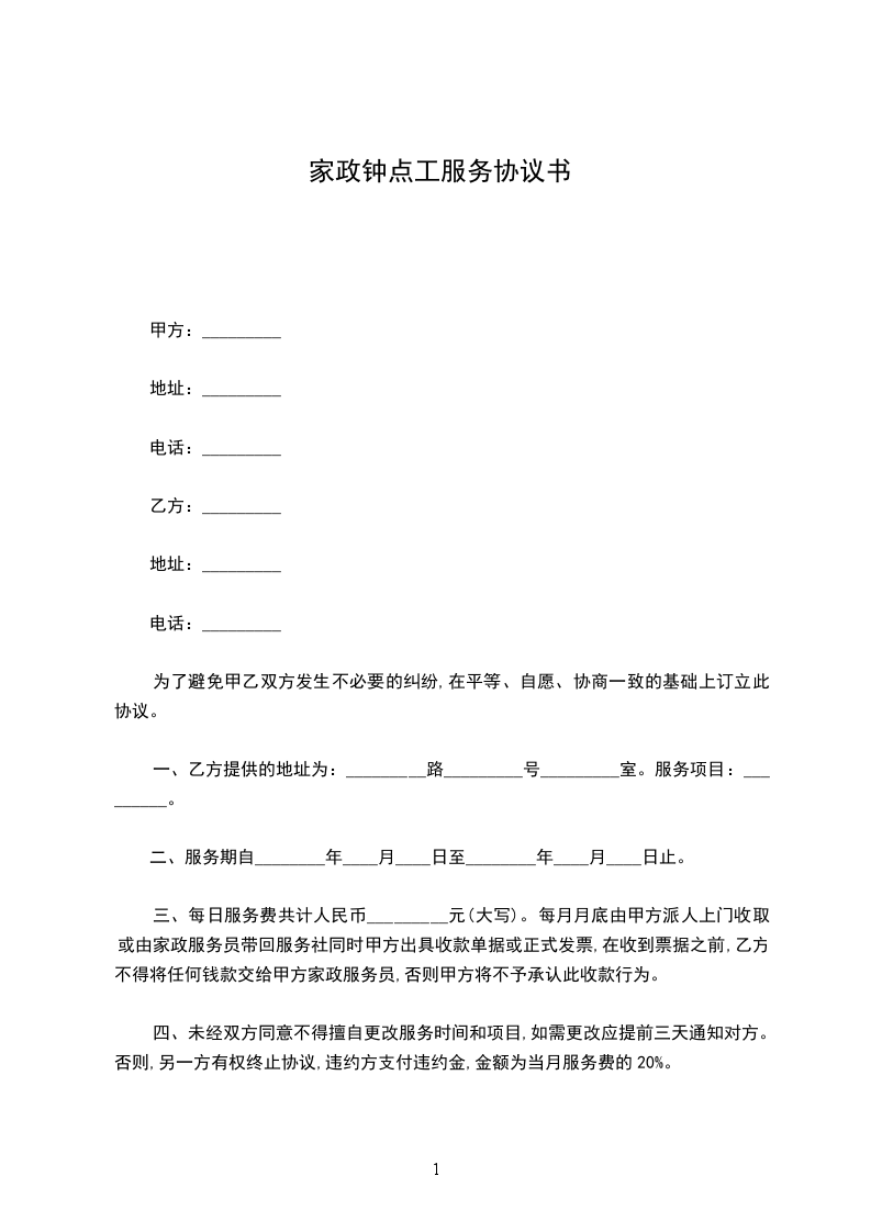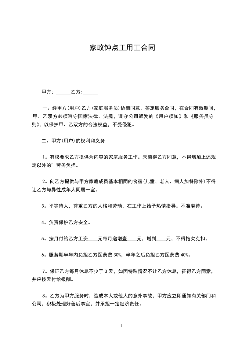 甲方因生活需要,聘请乙方为家政服务员,到甲方家中从事(钟点工□早教□育婴员□住家保姆□)服务,经双方面谈同意,签订以下协议,共同遵守: