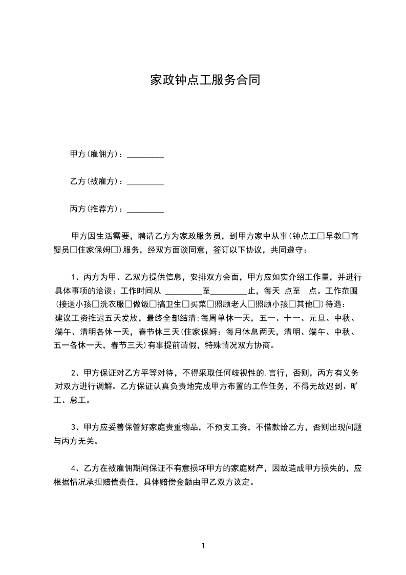1、丙方为甲、乙双方提供信息,安排双方会面,甲方应如实介绍工作量,并进行具体事项的洽谈:工作时间从_____年_____月_____日至_____年_____月_____日止,每天点至点。工作范围:(接送小孩□洗衣服□做饭□搞卫生□买菜□照顾老人□照顾小孩□其他□)待遇:,建议工资推迟五天发放,最终全部结清;每周单休一天,五一、十一、元旦、中秋、端午、清明各休一天,春节休三天(住家保姆:每月休息两天,清明、端午、中秋、五一各休一天,春节三天)有事提前请假,特殊情况双方协商。