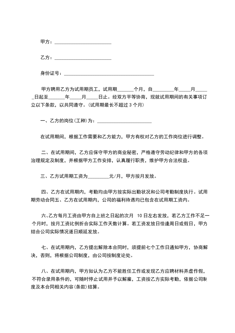 四、乙方在试用期内,考勤均由甲方按实际出勤状况和公司考勤制度执行。试用期劳动合同五、乙方在试用期内,公司的福利待遇均已包含在试用期工资内。