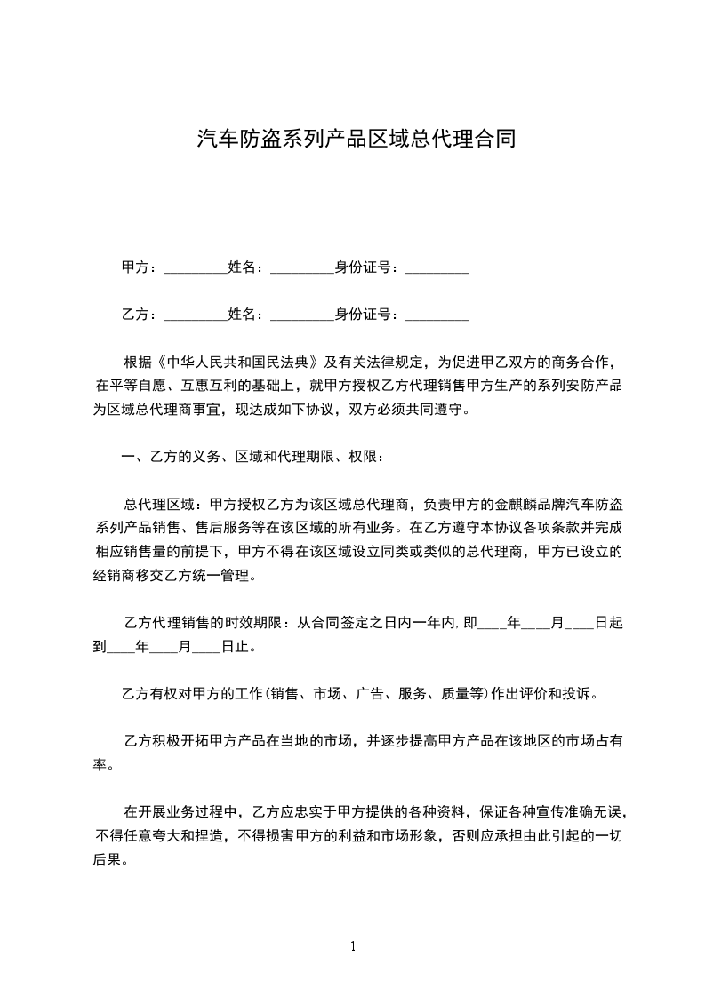 总代理区域:甲方授权乙方为该区域总代理商,负责甲方的金麒麟品牌汽车防盗系列产品销售、售后服务等在该区域的所有业务。在乙方遵守本协议各项条款并完成相应销售量的前提下,甲方不得在该区域设立同类或类似的总代理商,甲方已设立的经销商移交乙方统一管理。