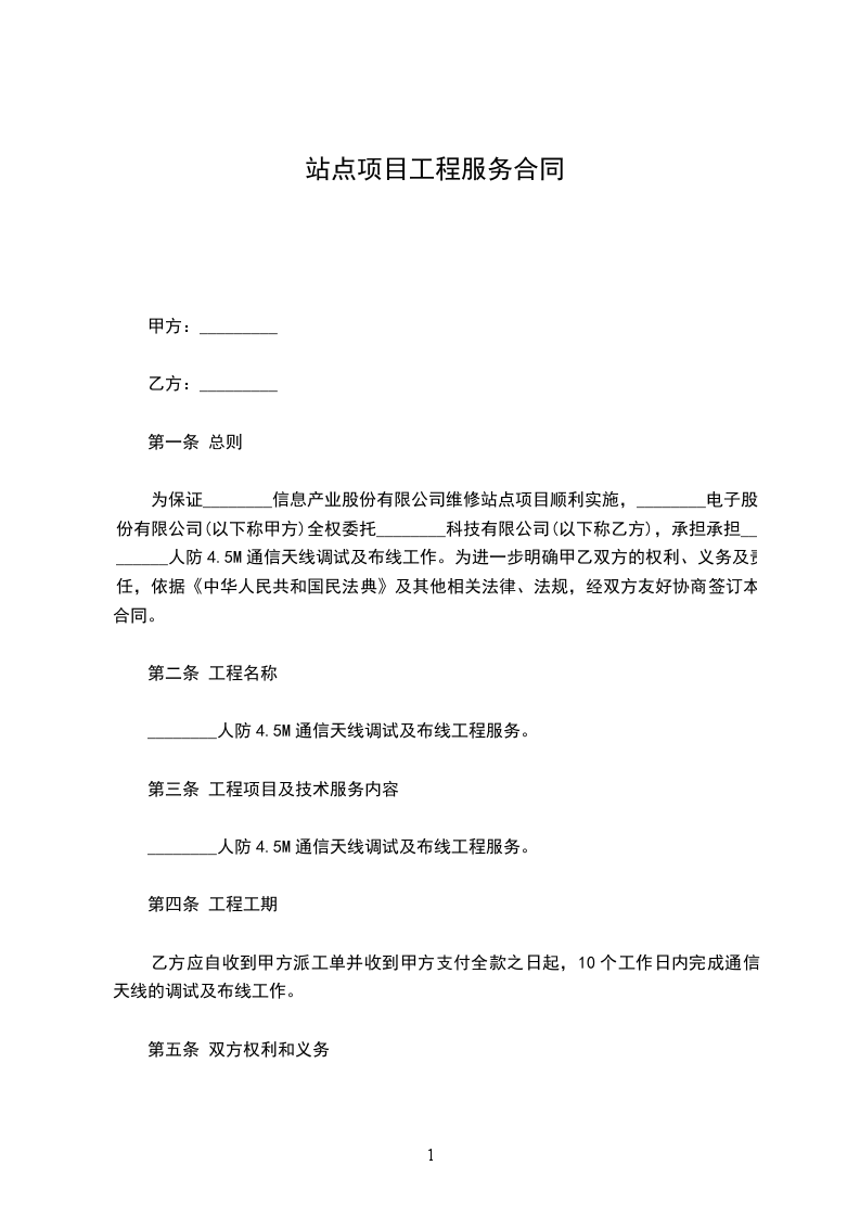 为保证________信息产业股份有限公司维修站点项目顺利实施,________电子股份有限公司(以下称甲方)全权委托________科技有限公司(以下称乙方),承担承担________人防4.5M通信天线调试及布线工作。为进一步明确甲乙双方的权利、义务及责任,依据《中华人民共和国民法典》及其他相关法律、法规,经双方友好协商签订本合同。