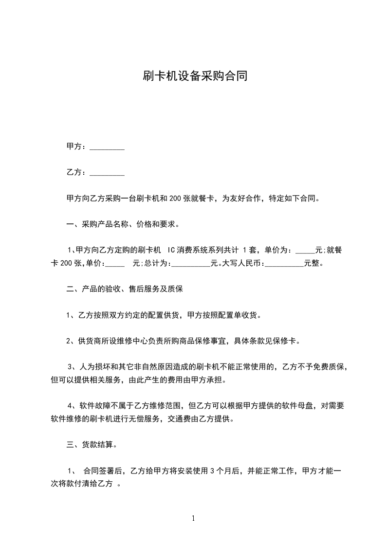 甲方向乙方采购一台刷卡机和200张就餐卡,为友好合作,特定如下合同。