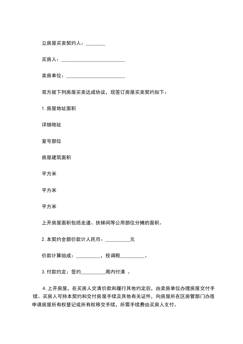 4.上开房屋,在买房人交清价款和履行其他约定后,由卖房单位办理房屋交付手续。买房人可持本契约和交付房屋手续及其他有关证件,向房屋所在区房管部门办理申请房屋所有权登记或所有权移交手续,所需手续费由买房人支付。