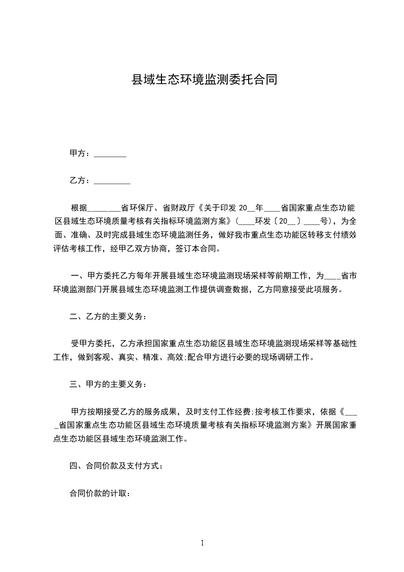 根据________省环保厅、省财政厅《关于印发20__年____省国家重点生态功能区县域生态环境质量考核有关指标环境监测方案》(____环发〔20__〕____号),为全面、准确、及时完成县域生态环境监测任务,做好我市重点生态功能区转移支付绩效评估考核工作,经甲乙双方协商,签订本合同。