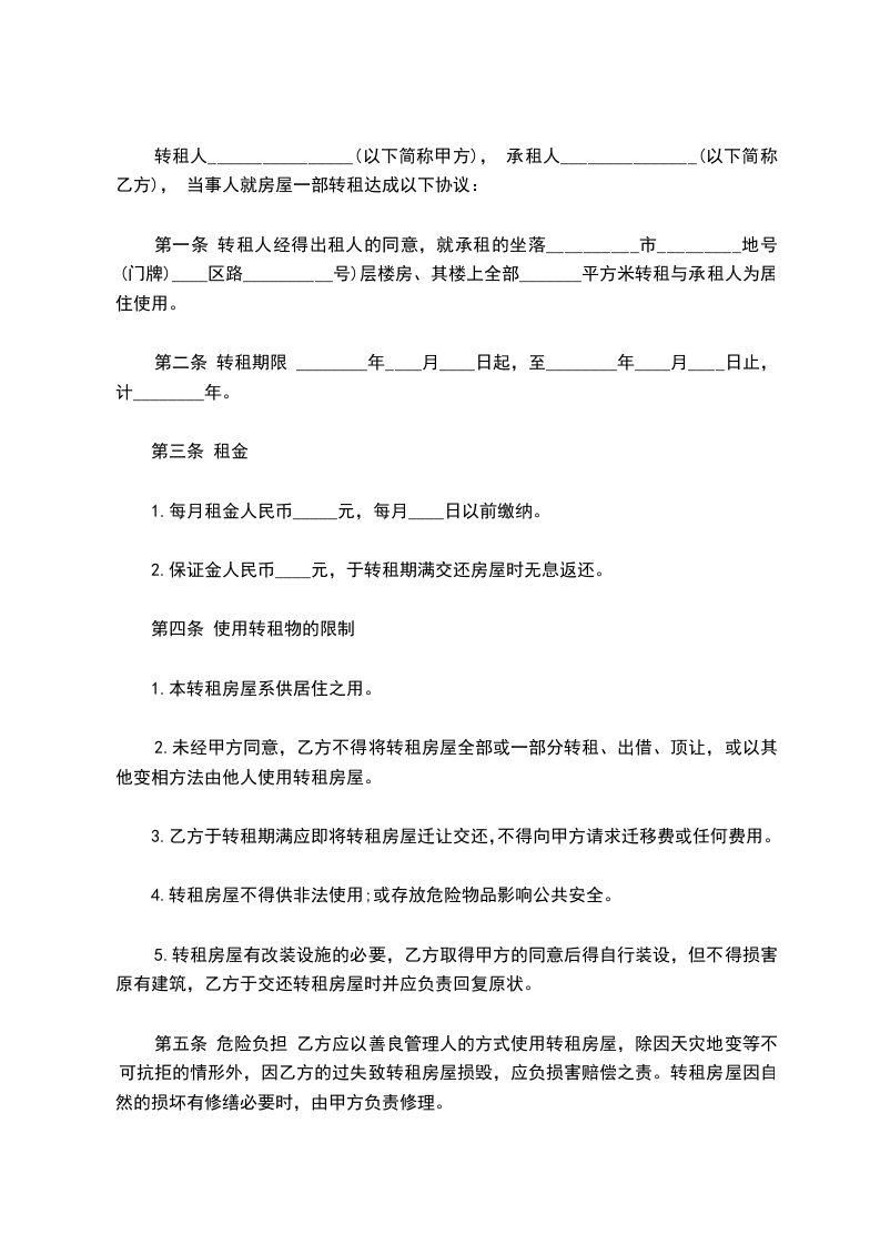 第一条 转租人经得出租人的同意,就承租的坐落__________市_________地号(门牌)____区路__________号)层楼房、其楼上全部_______平方米转租与承租人为居住使用。