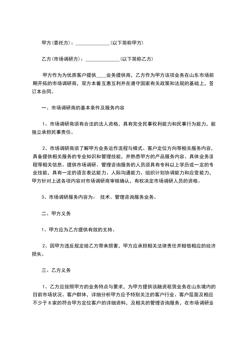甲方作为为优质客户提供____业务提供商,乙方作为甲方该项业务在山东市场前期开拓的市场调研商,双方本着互惠互利并在遵守国家有关政策和法规的基础上,签订本合同。