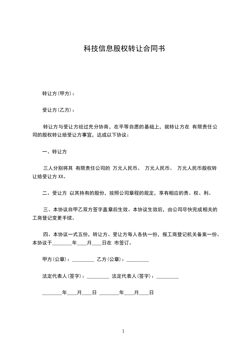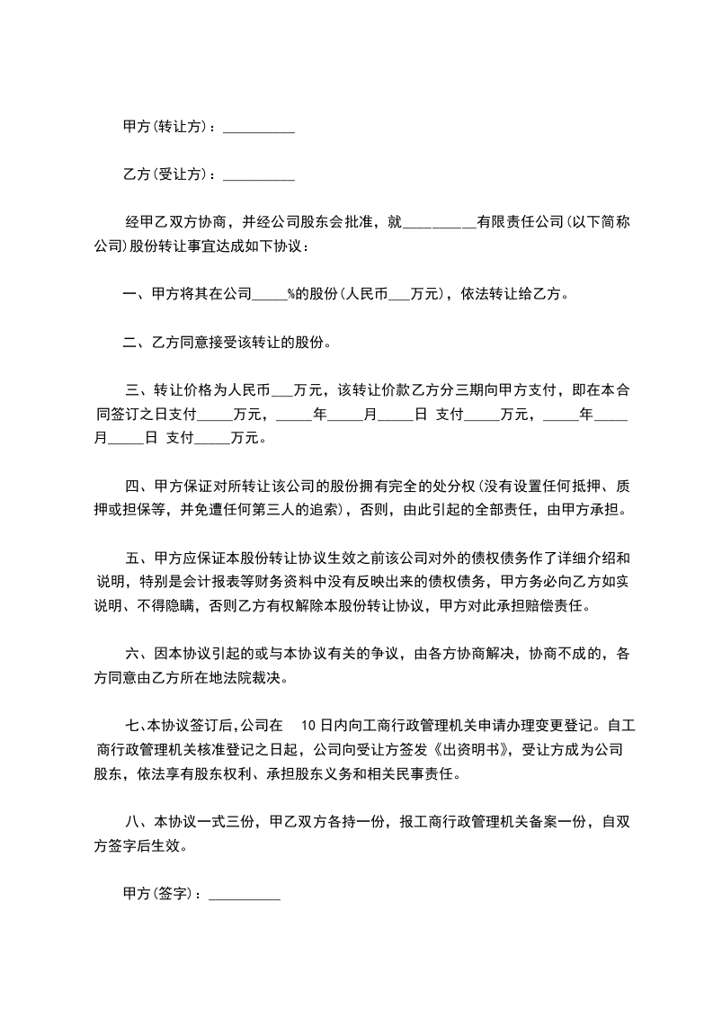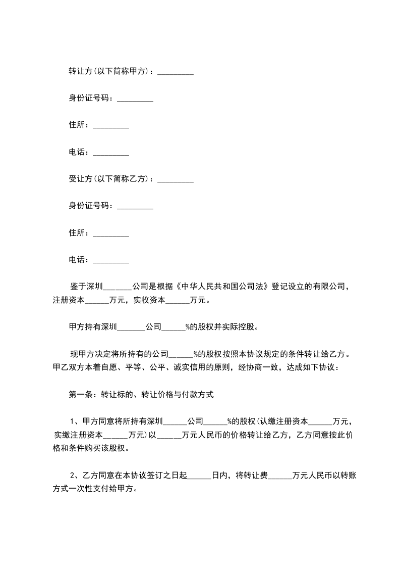 1、甲方同意将所持有深圳______公司______%的股权(认缴注册资本______万元,实缴注册资本______万元)以______万元人民币的价格转让给乙方,乙方同意按此价格和条件购买该股权。