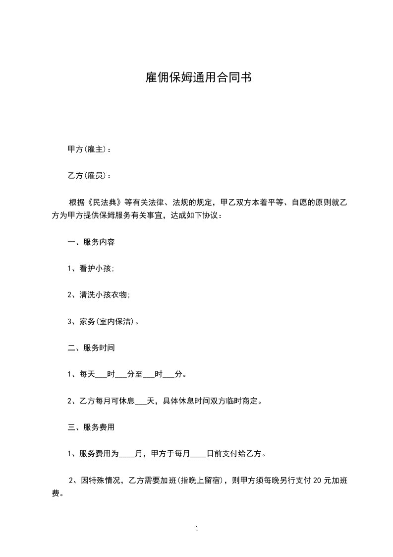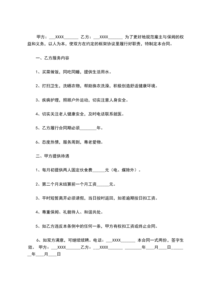 甲方(雇主): 身份证号: 乙方(雇员): 身份证号: 根据《民法典》等有关法律、法规的规定,甲乙双方本着平等、自愿的原则就乙方为甲方提供保姆服务有关事宜,达成如下协议: