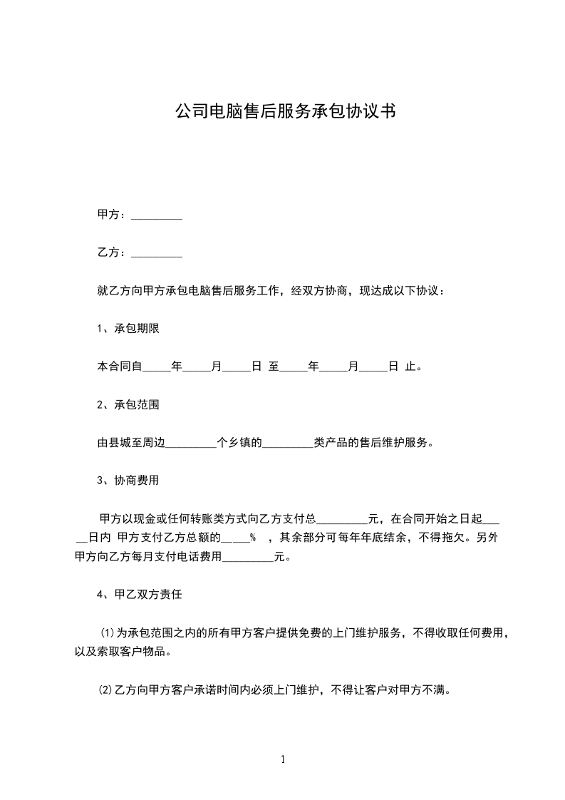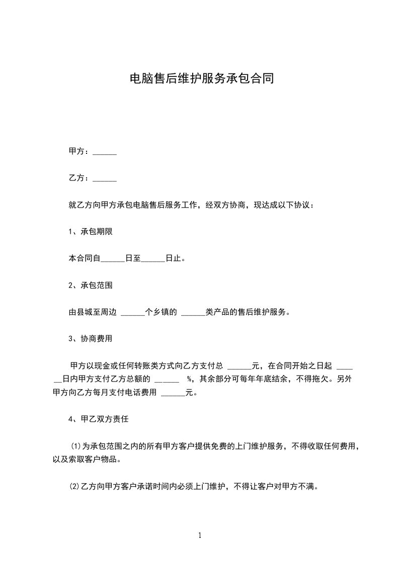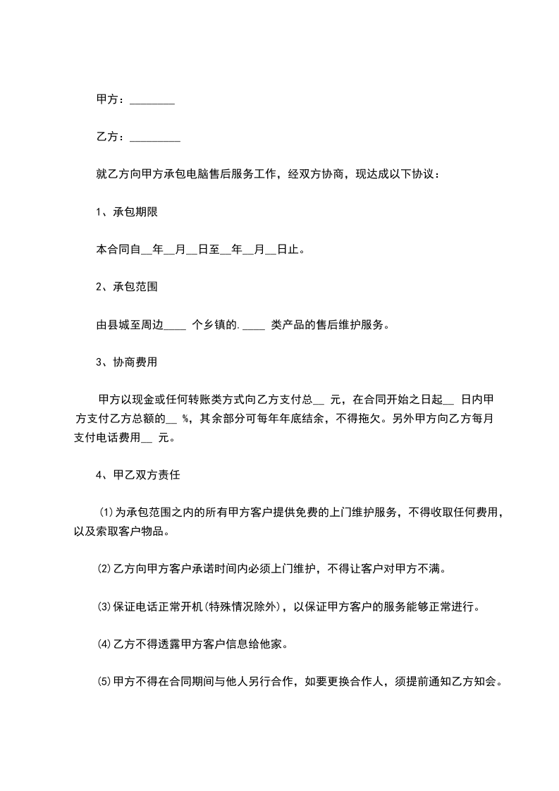 就乙方向甲方承包电脑售后服务工作,经双方协商,现达成以下协议: