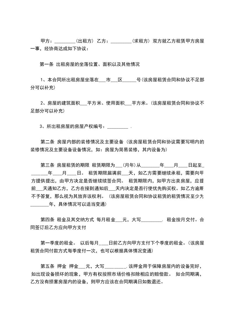 甲方:_________(出租方) 乙方:_________(求租方) 双方就乙方租赁甲方房屋一事,经协商达成如下协议:
