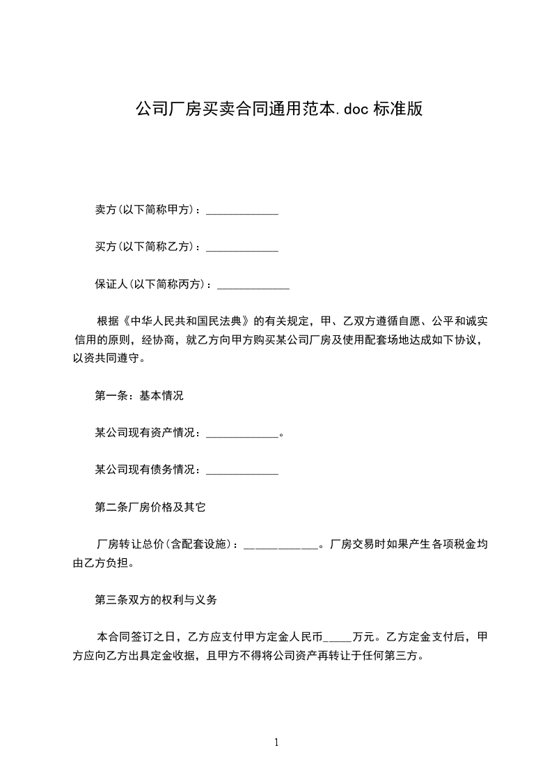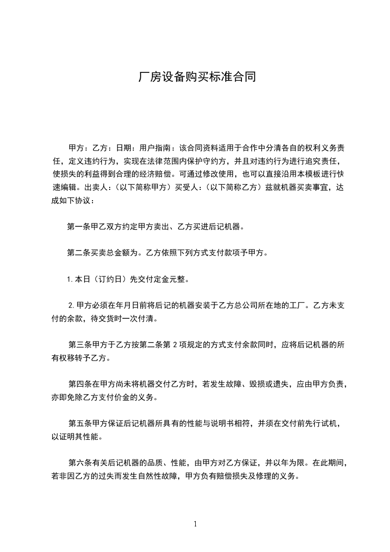 1、 乙方购买甲方坐落在_________市_______________区(县)_____________路_________ ________号厂房______层,厂房建筑面积_____________平方米,并配套场地______________平方米,按房产证为准。