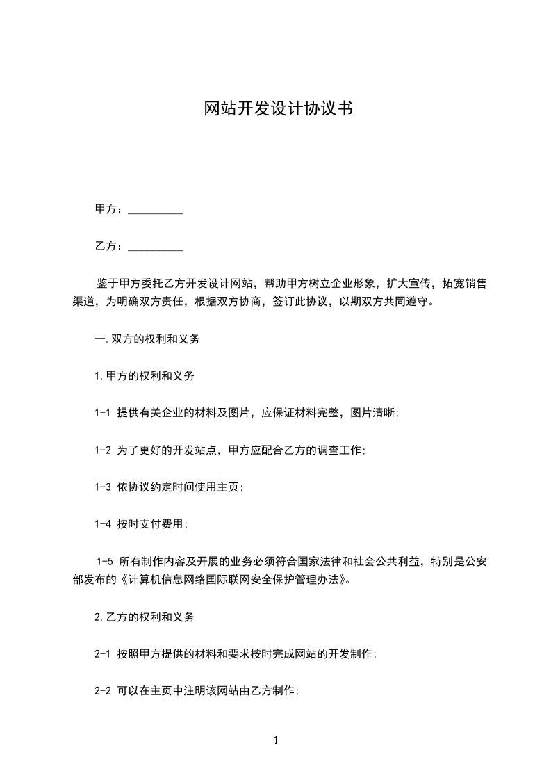 鉴于甲方委托乙方开发设计网站,帮助甲方树立企业形象,扩大宣传,拓宽销售渠道,为明确双方责任,根据双方协商,签订此协议,以期双方共同遵守。