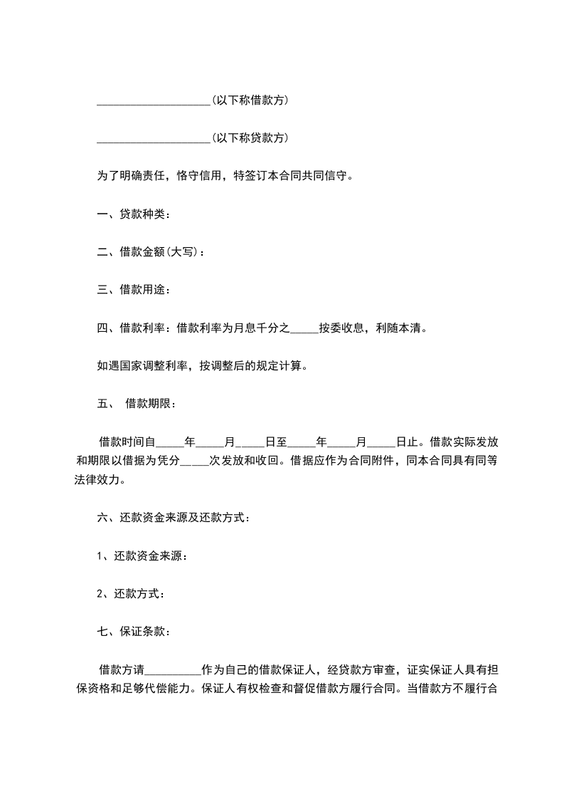 借款方请__________作为自己的借款保证人,经贷款方审查,证实保证人具有担保资格和足够代偿能力。保证人有权检查和督促借款方履行合同。当借款方不履行合同时,由保证方连带承担偿还借款本息的责任。必要时,贷款方可以从保证方的存款账户内扣收。