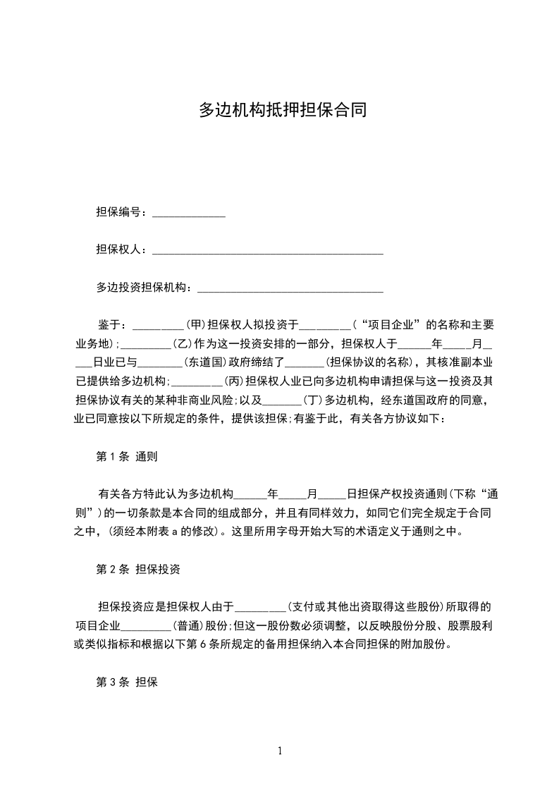 鉴于:_________(甲)担保权人拟投资于_________(“项目企业”的名称和主要业务地);_________(乙)作为这一投资安排的一部分,担保权人于______年_____月_____日业已与________(东道国)政府缔结了_______(担保协议的名称),其核准副本业已提供给多边机构;_________(丙)担保权人业已向多边机构申请担保与这一投资及其担保协议有关的某种非商业风险;以及_______(丁)多边机构,经东道国政府的同意,业已同意按以下所规定的条件,提供该担保;有鉴于此,有关各方协议如下: