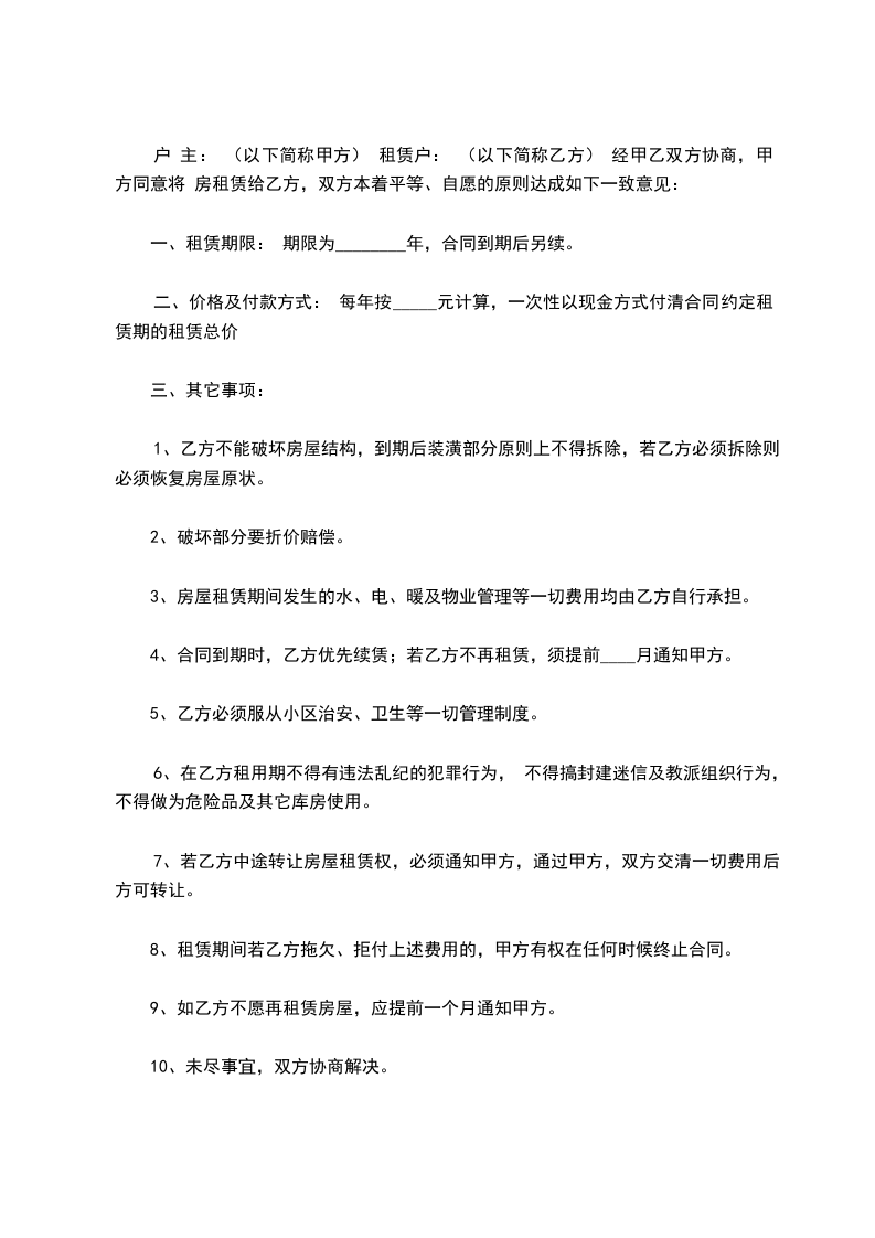 户 主: (以下简称甲方) 租赁户: (以下简称乙方) 经甲乙双方协商,甲方同意将 房租赁给乙方,双方本着平等、自愿的原则达成如下一致意见: