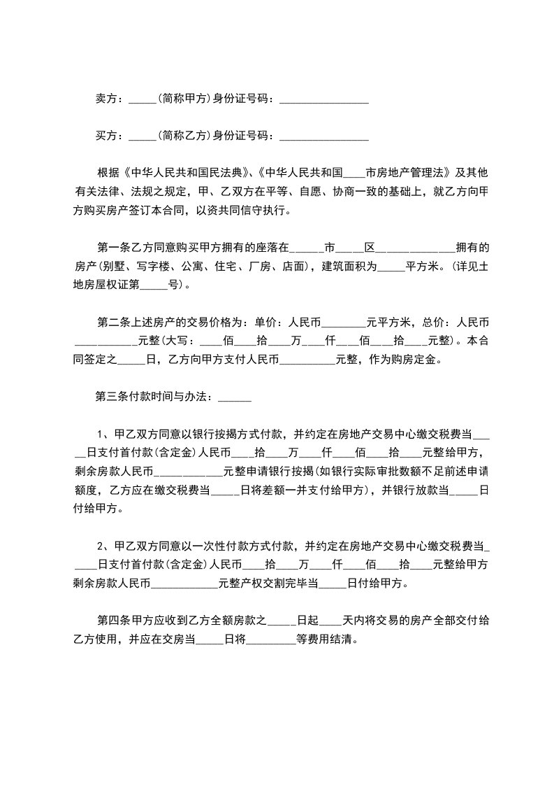 第一条乙方附和收购甲方具有坐落在______市_____区________________________具有的房产(别墅、写字楼、居处、厂房、店面),建筑面积为_____平方米。(详情见土地房子权证第_______________号)