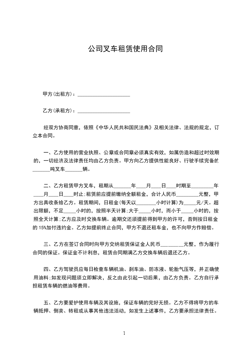 一、乙方使用的营业执照、公章或合同章必须真实有效,如属仿造和超过时效期的,一切经济及法律责任均由乙方负责。甲方向乙方提供性能良好、行驶手续完备的_______吨叉车_______辆。