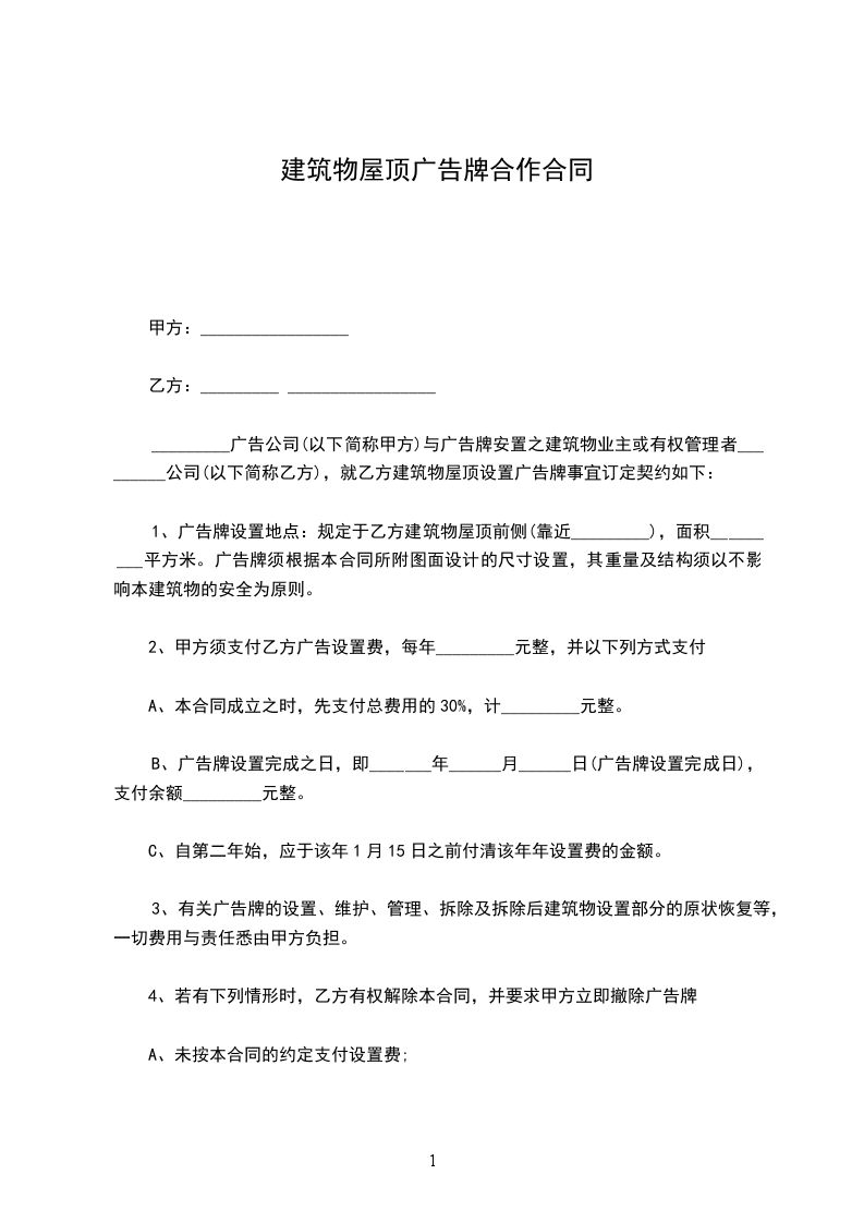 _________广告公司(以下简称甲方)与广告牌安置之建筑物业主或有权管理者_________公司(以下简称乙方),就乙方建筑物屋顶设置广告牌事宜订定契约如下: