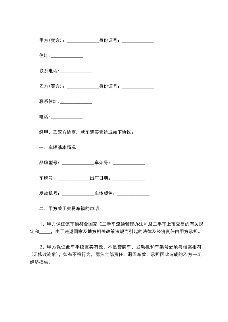 2、甲方保证此车手续真实有效,不是套牌车,发动机和车架号必须与档案相符(无修改迹象),如有不符行为,愿负全部责任,退回车款,承担因此造成的乙方一切经济损失。