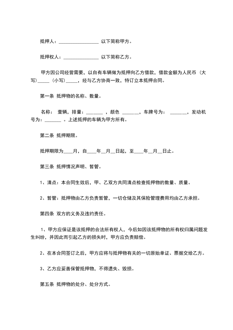甲方因公司经营需要,以自有车辆做为抵押向乙方借款,借款金额为人民币 (大写)_____ (小写)_____,经与乙方协商一致,特订立本抵押合同。