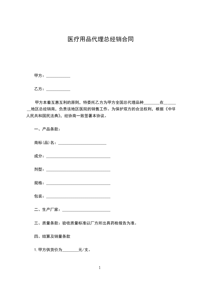 甲方本着互惠互利的原则,特委托乙方为甲方全国总代理品种________在________地区总经销商,负责该地区医院的销售工作。为保护双方的合法权利,根据《中华人民共和国民法典》,经协商一致签署本协议。